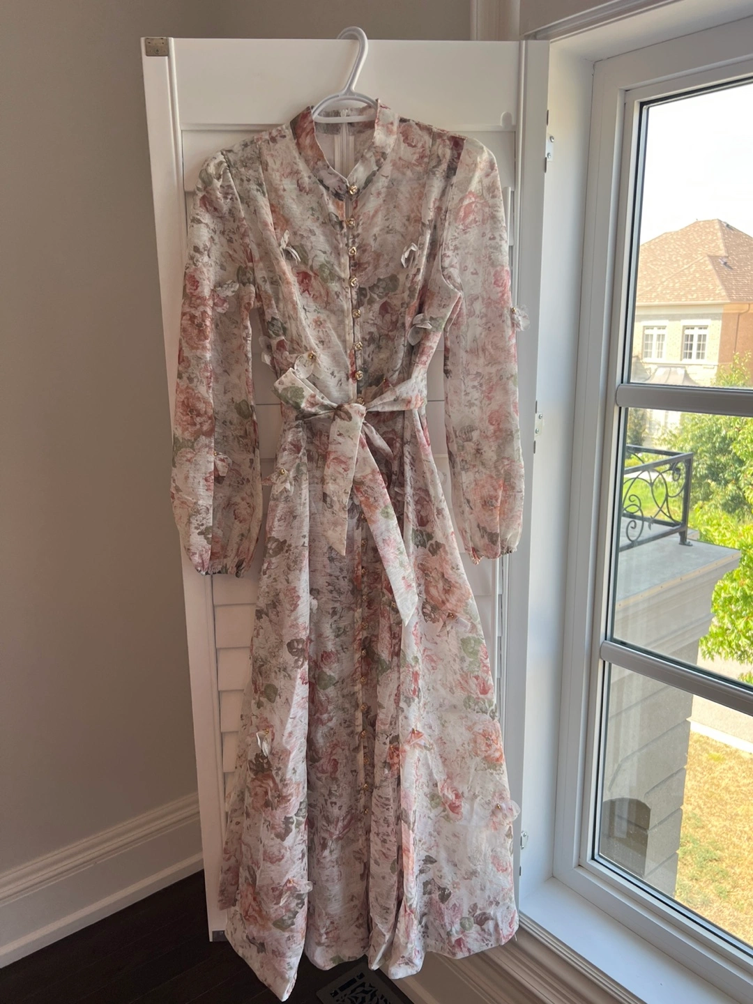 Selling a beautiful floral print maxi dress. It features a delicate floral pattern in soft, muted tones, perfect for a garden party or a special occasion. The dress has long sleeves and a flattering silhouette with a tie at the waist. It's in great condition and ready for a new home!