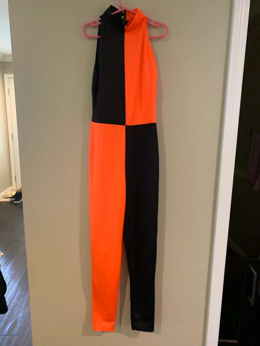 Selling a stylish acro jumpsuit from Stage Boutique! It features a cool colour block design with orange and black. There are some minor signs of wear, but overall it's in good condition and ready for a new home