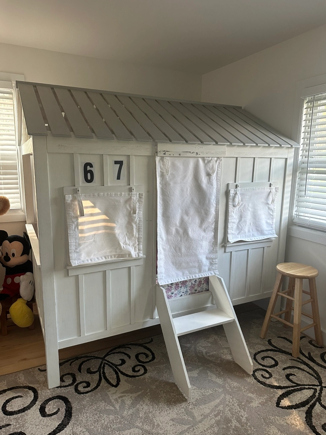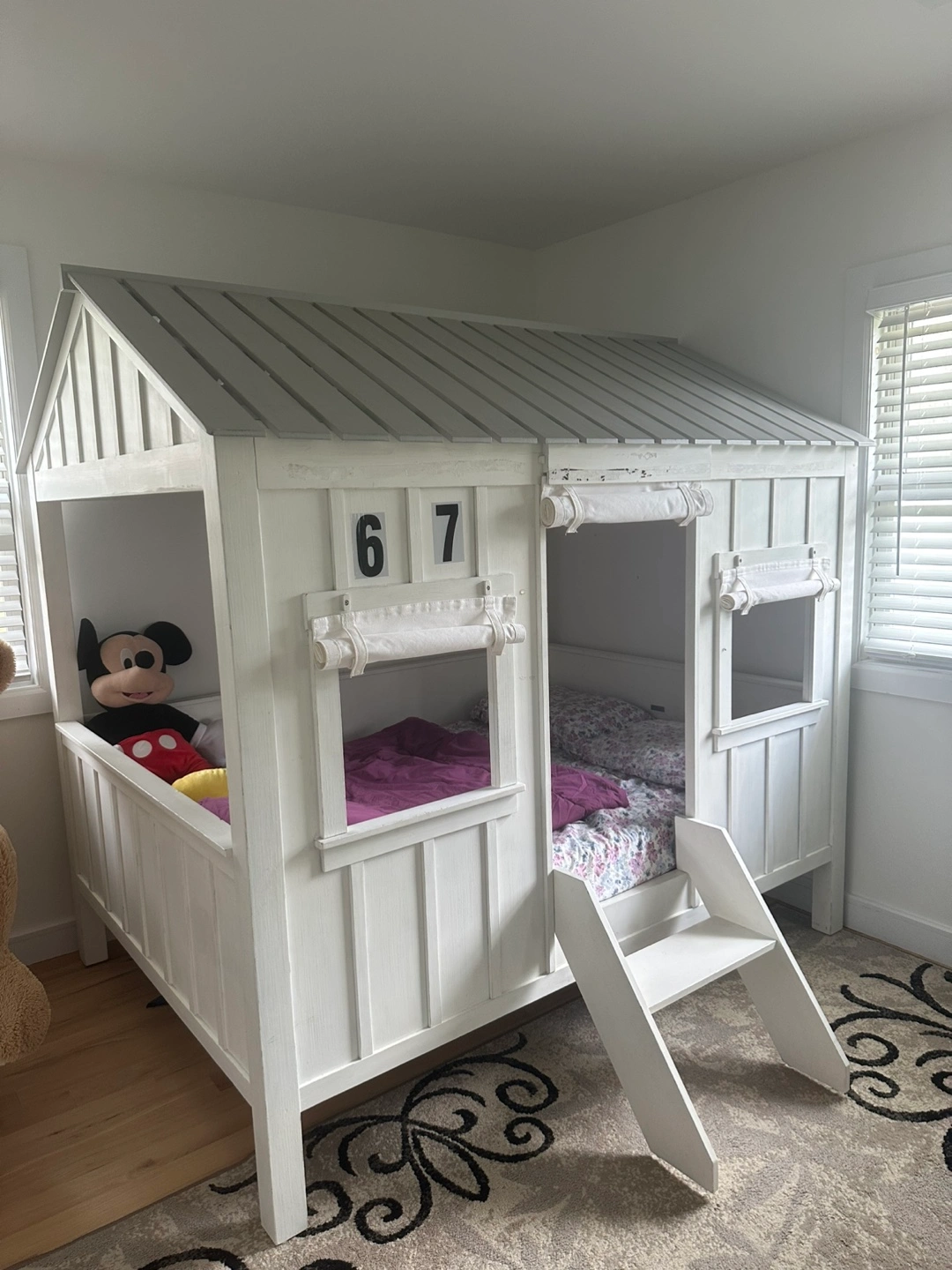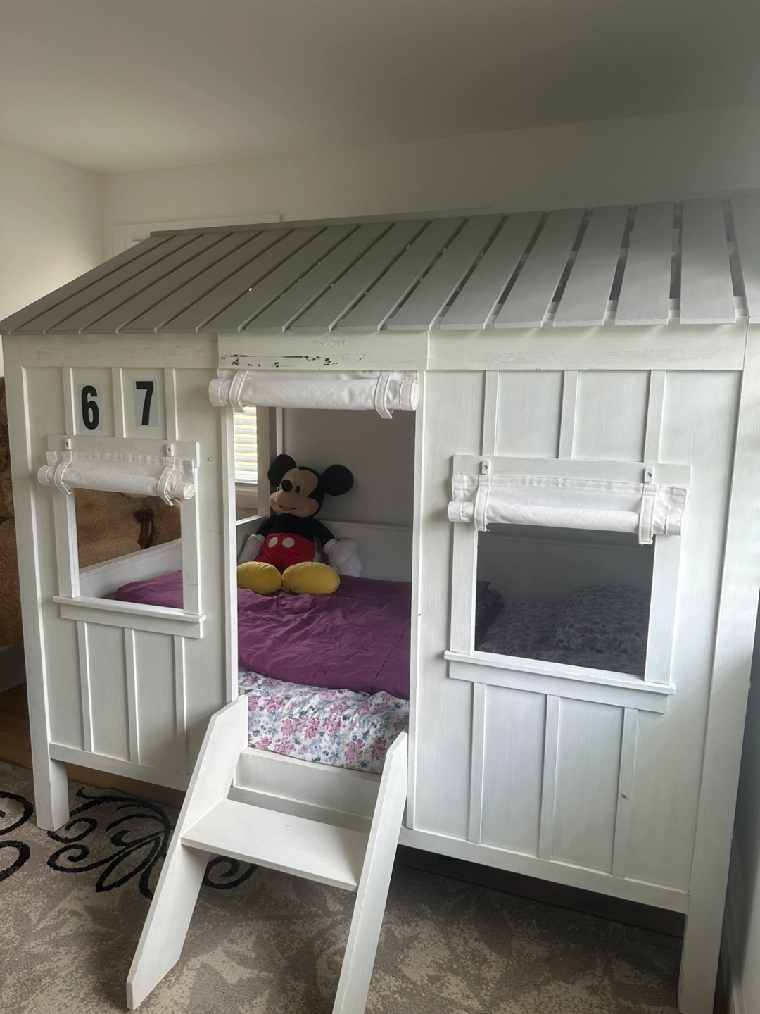 10Selling a Cabin Bed in Weathered White! It's a super cute bed that looks like a little house and is perfect for a kid's room. It's in great condition and ready for a new home. *You also got a free mattress * They both are in perfect condition . FULL size bed,fits Perfect for two kids.
