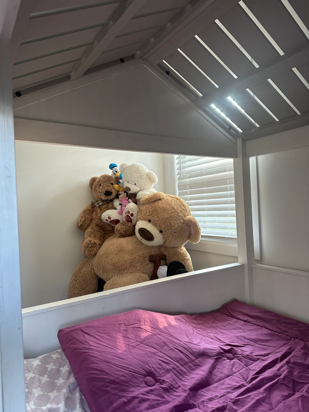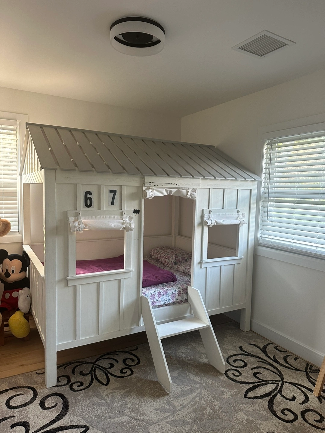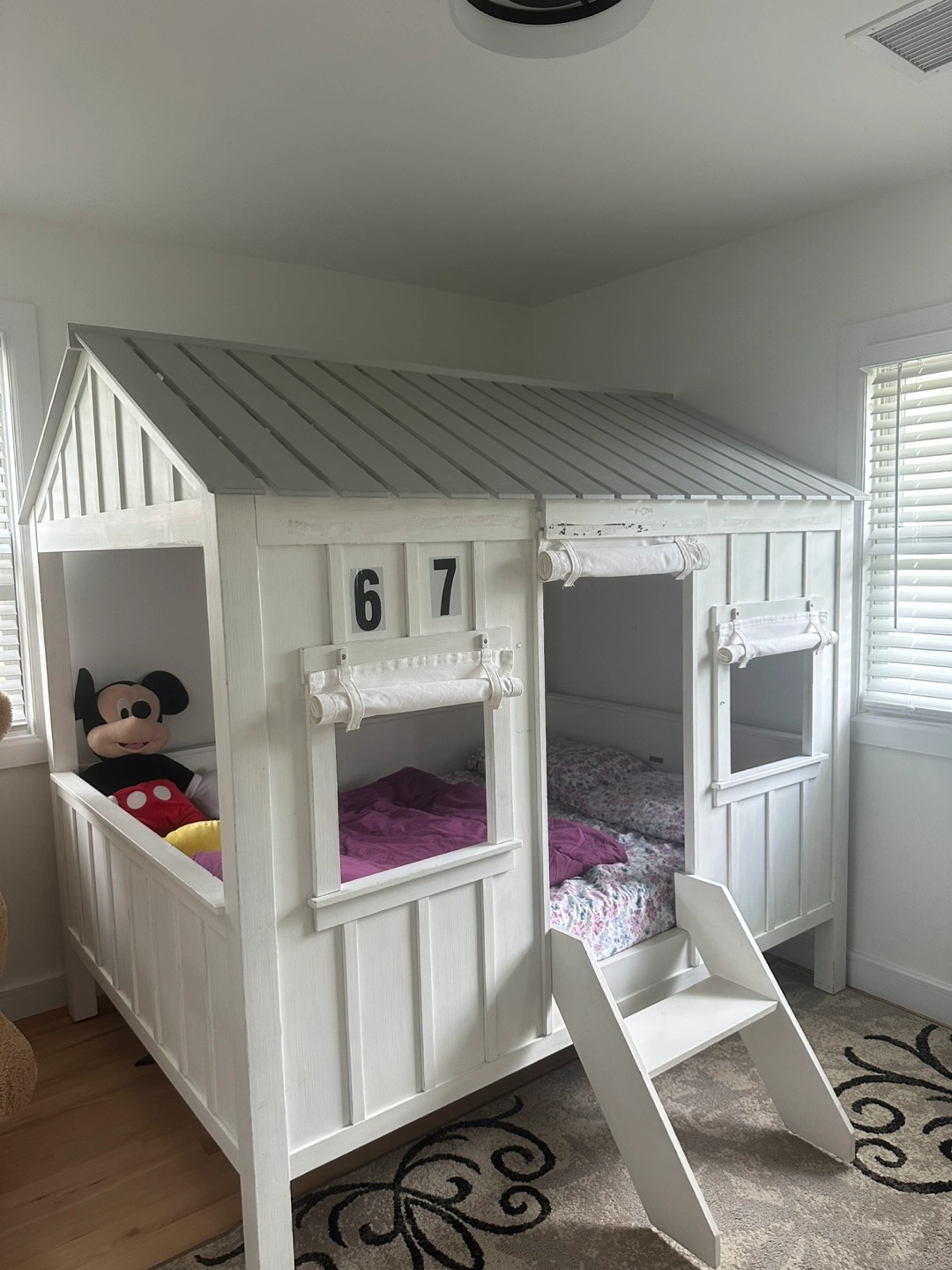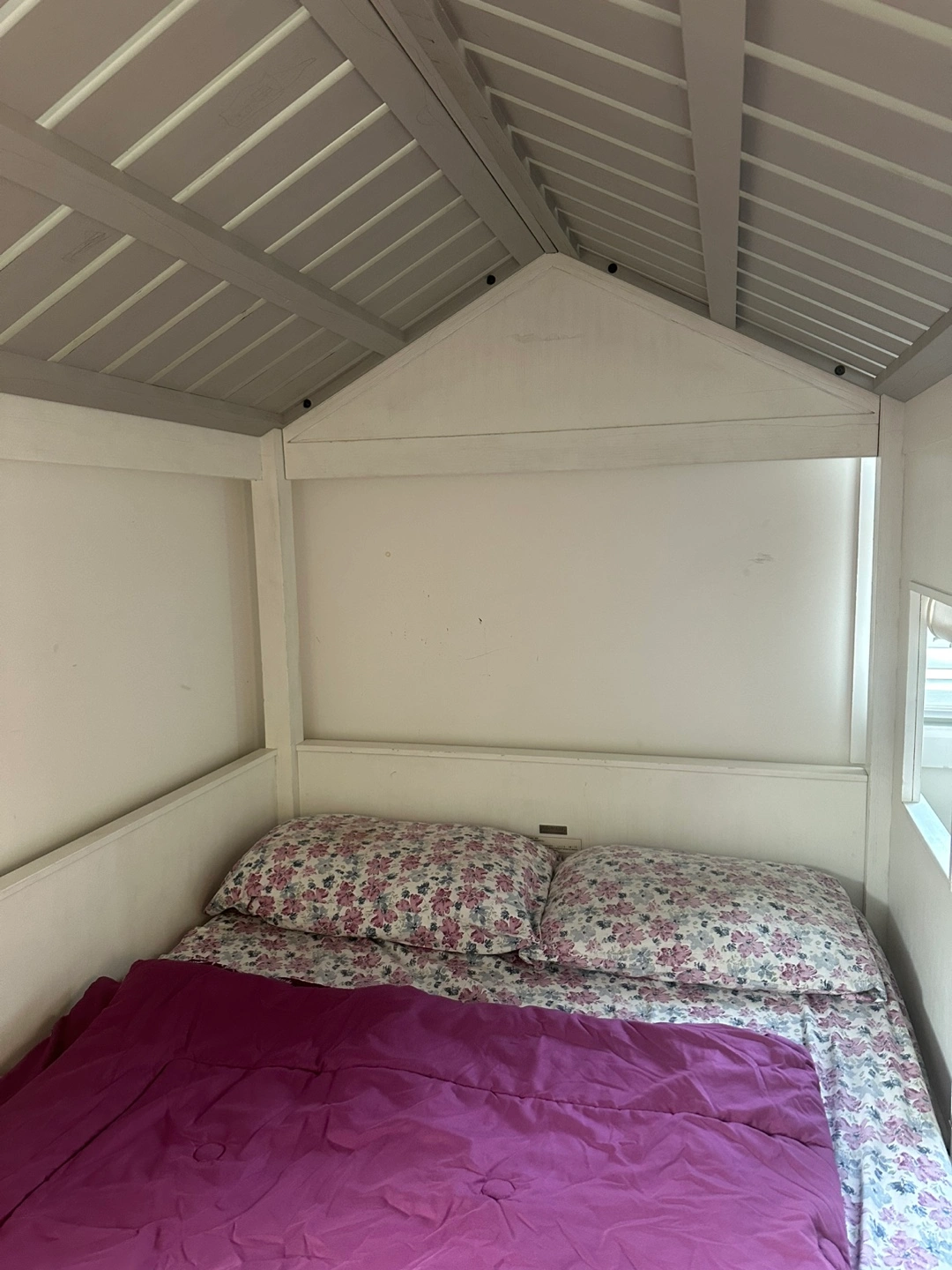 10Selling a Cabin Bed in Weathered White! It's a super cute bed that looks like a little house and is perfect for a kid's room. It's in great condition and ready for a new home. *You also got a free mattress * They both are in perfect condition . FULL size bed,fits Perfect for two kids.