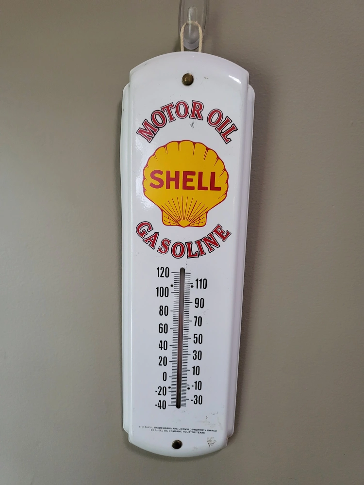 Selling a Shell Motor Oil Gasoline thermometer. It's a nice vintage piece with the classic Shell logo. The thermometer reads in both Celsius and Fahrenheit but doesn't work. Perfect for adding a retro touch to your garage or collection!