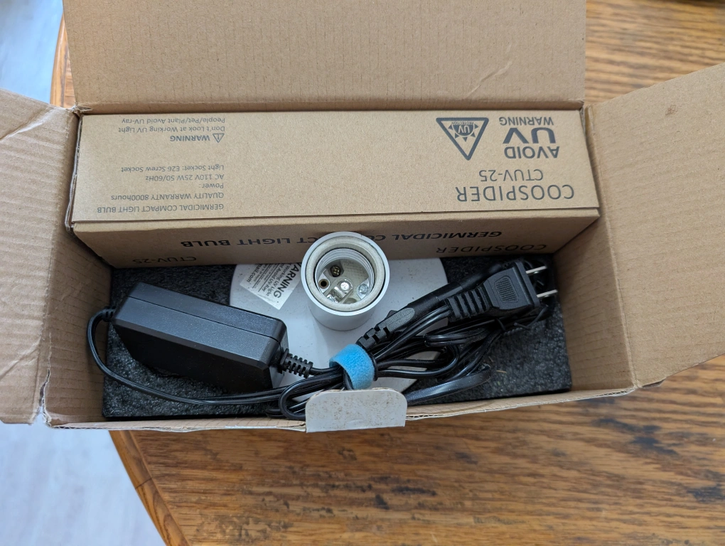 Selling a Coospider CTUV-25 UVC Germicidal Lamp. It comes with the box and included components like the light socket and power adapter. It's a germicidal compact light bulb designed to emit UV-C light. It has an 8000hr warranty!