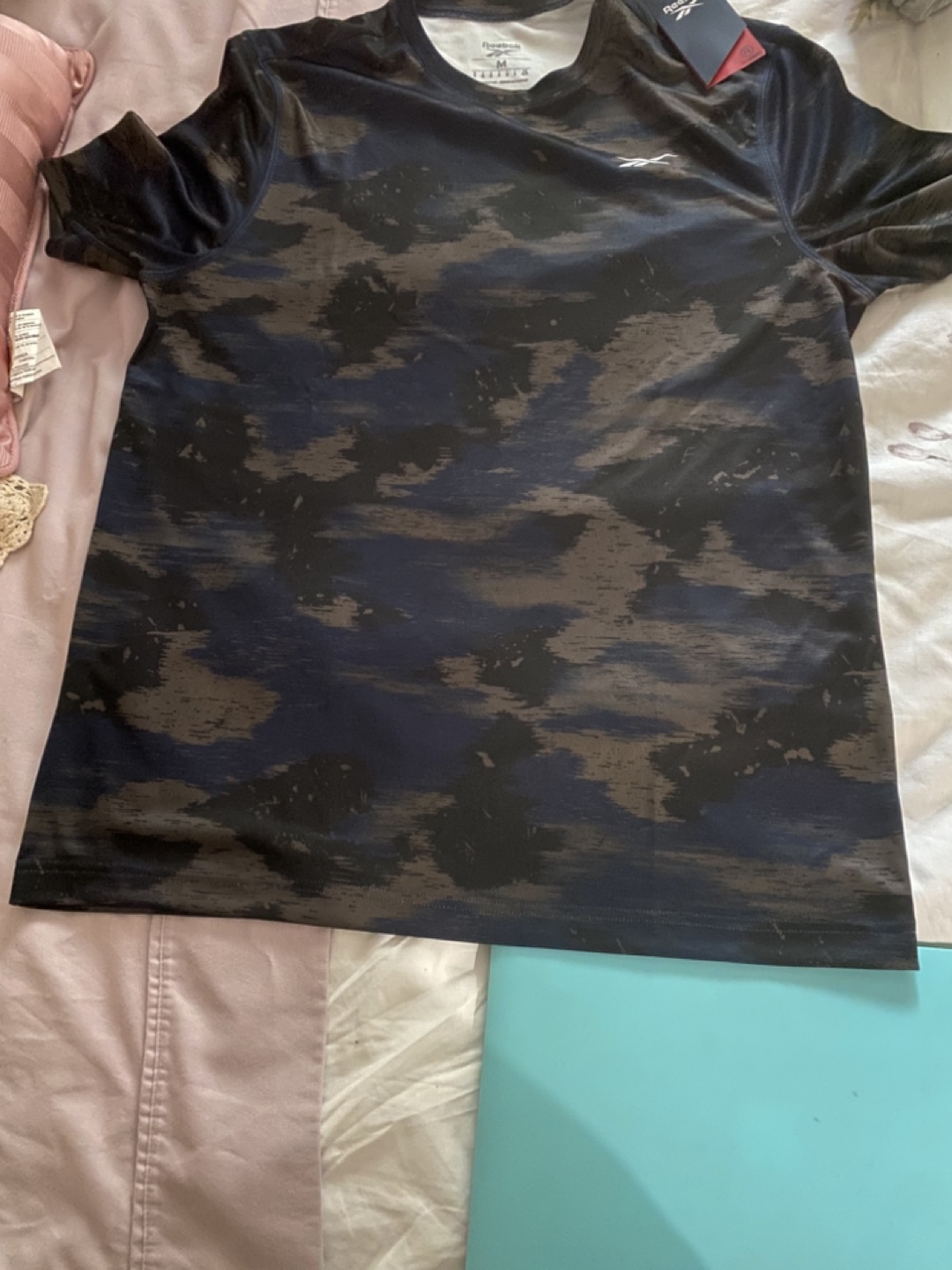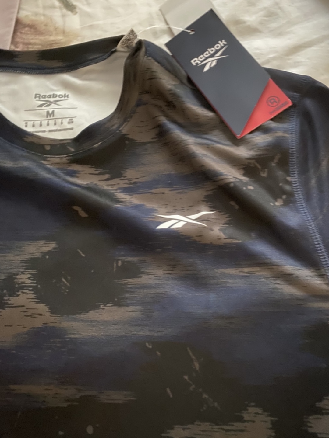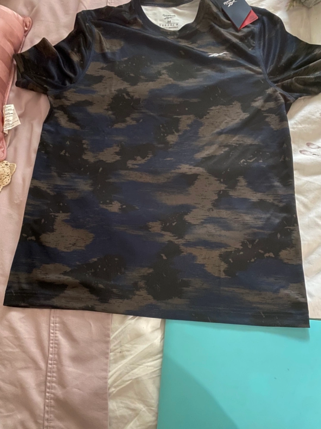 Brand new with tags Reebok t-shirt in size medium! The shirt has a cool camo-like design in shades of black, blue, and brown. Perfect for workouts or casual wear