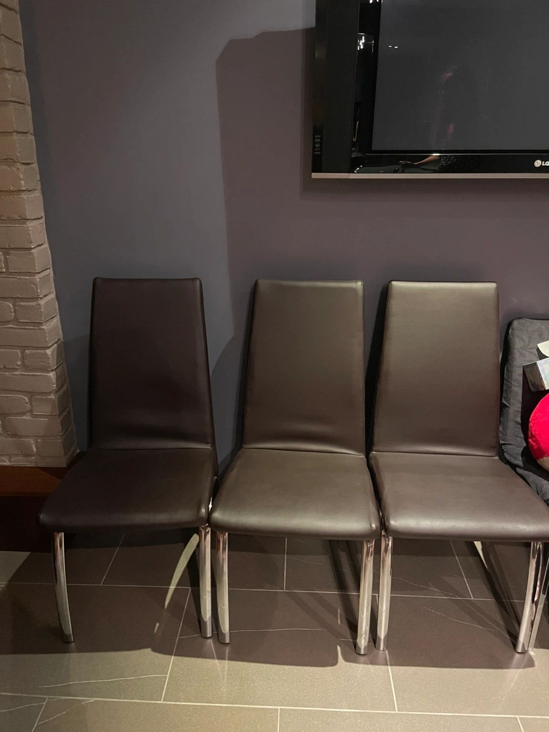 Selling a set of three dining chairs! They have a sleek design with brown seats and chrome legs. Perfect for adding a touch of modern style to your dining area or kitchen.