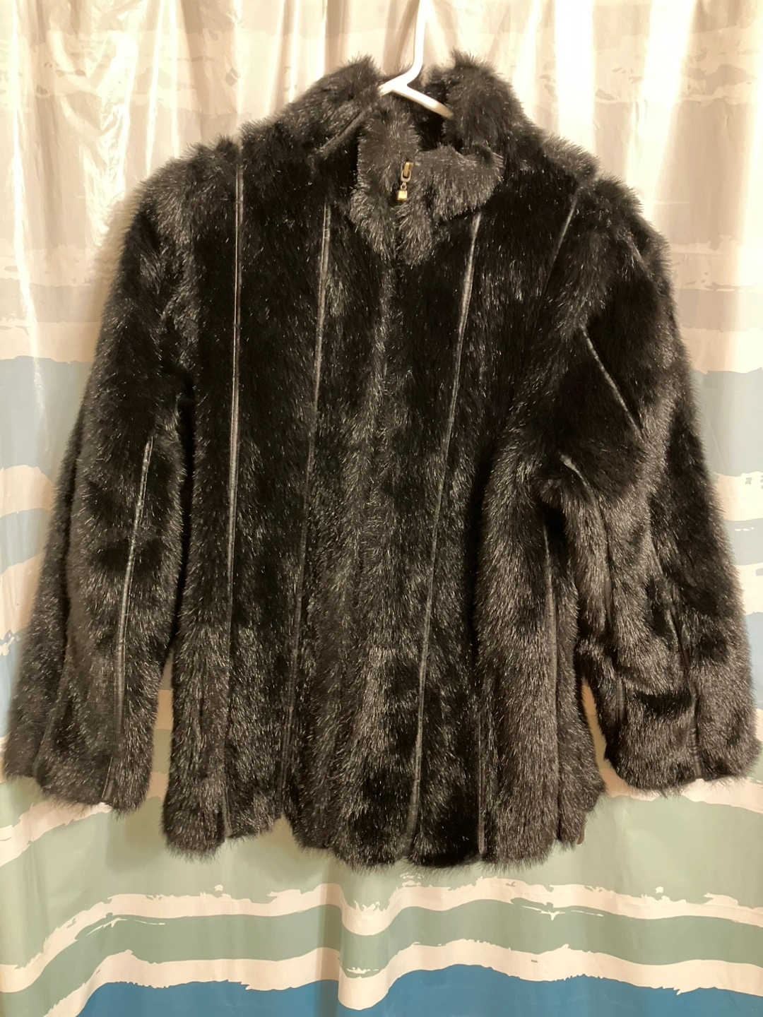 Here's a cozy black faux fur jacket! It's super soft and warm, perfect for chilly days. It has a zipper closure and a stylish design. It's in great condition and ready for a new home