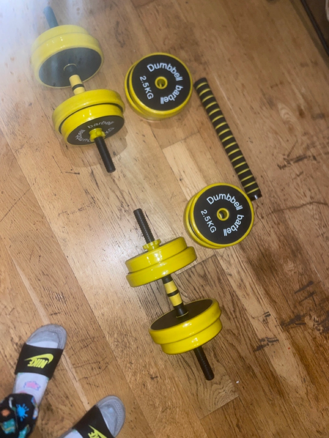 I'm selling a dumbbell barbell set in yellow and black. The weights are labeled as 2.5 KG and 2.75 KG. Perfect for home workouts!