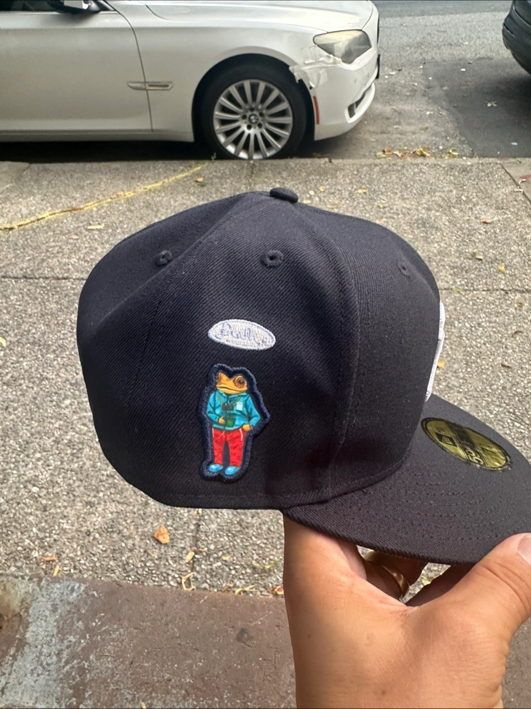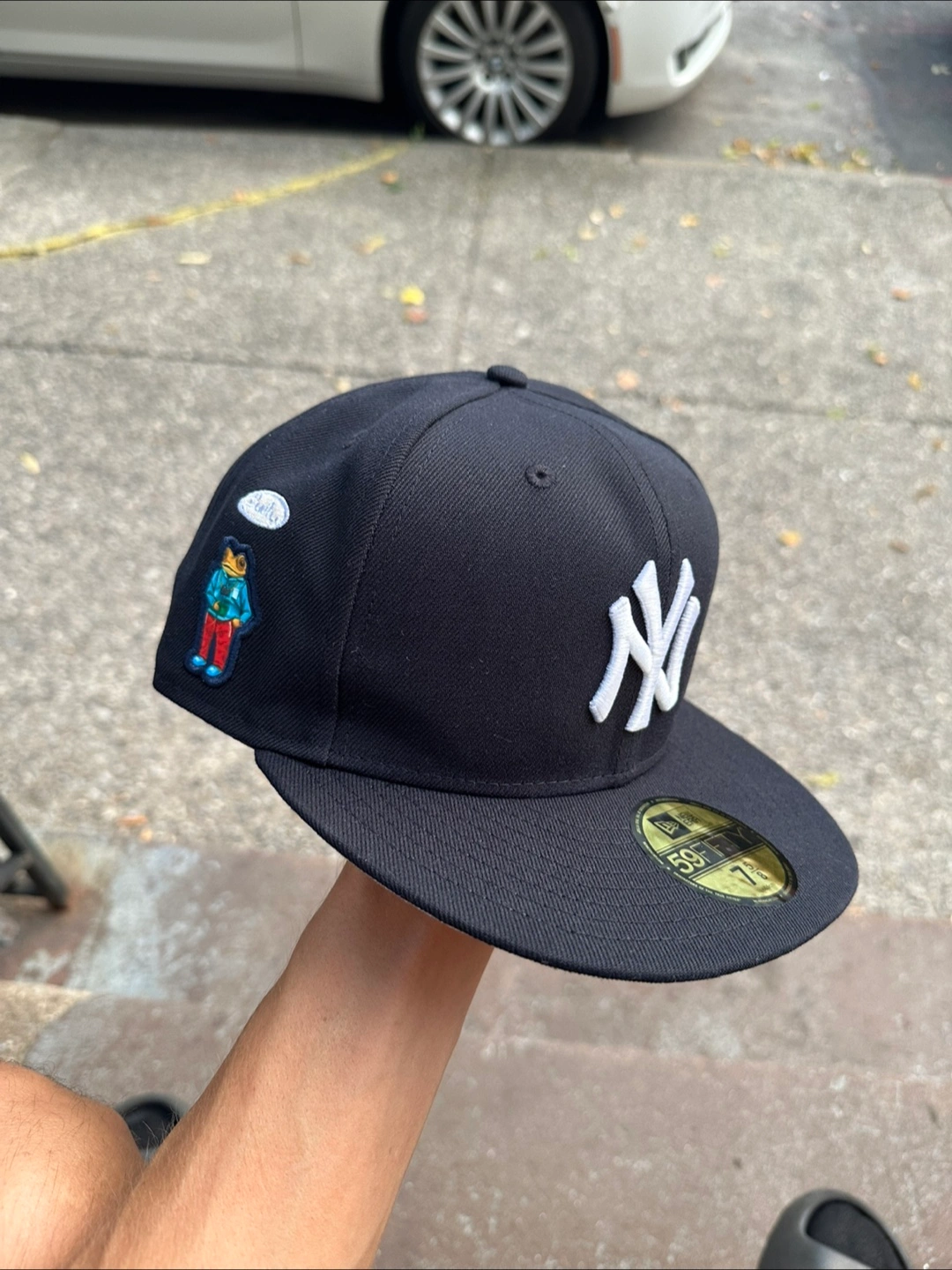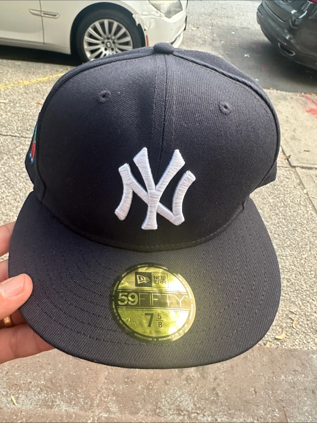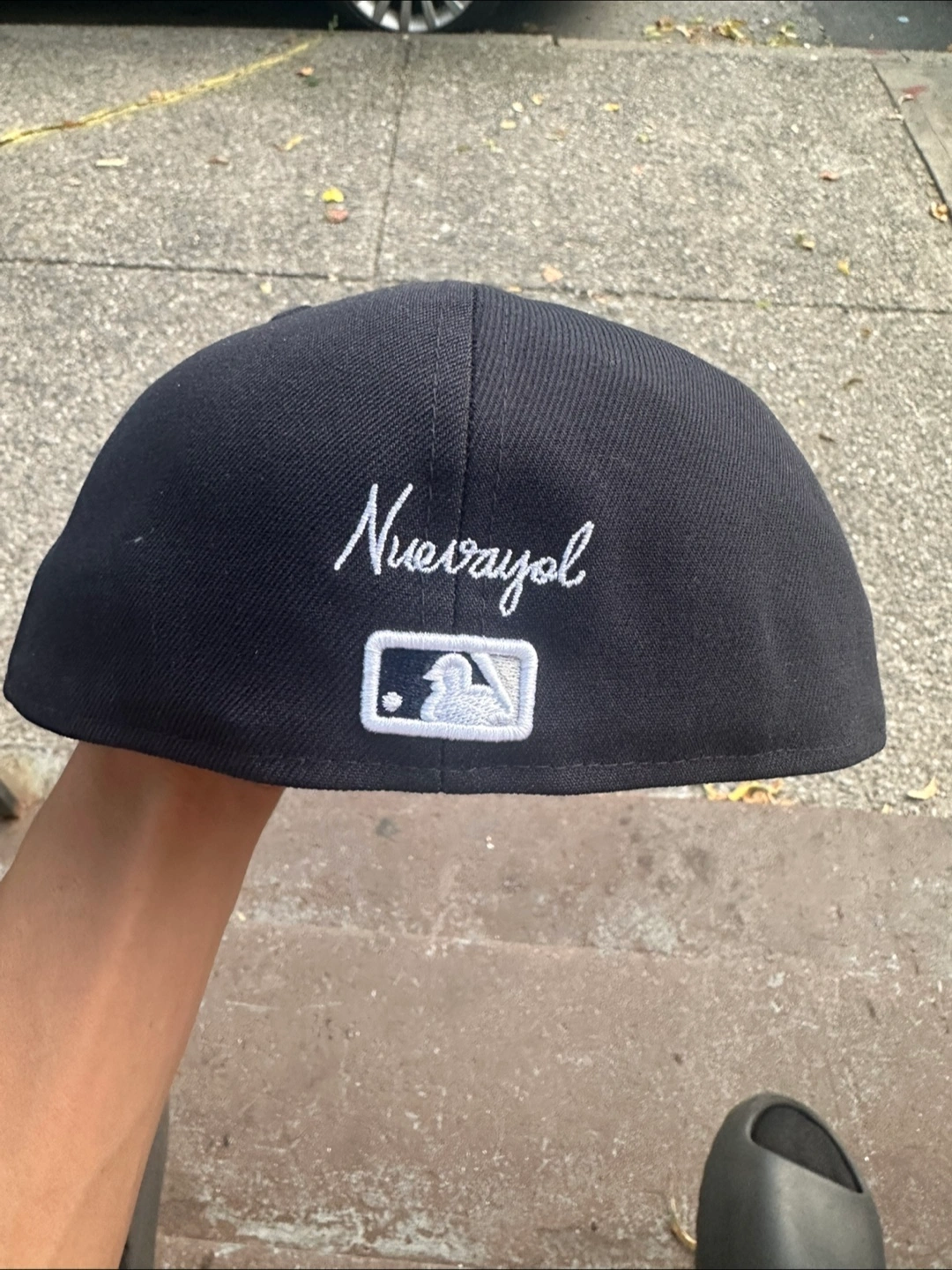 Selling a New Era NY Yankees fitted hat in size 7 5/8. The hat is in great condition and features a unique design with patches on the side. It has the classic Yankees logo on the front and 'Nueva York' embroidered on the back. Perfect for any Yankees fan!
