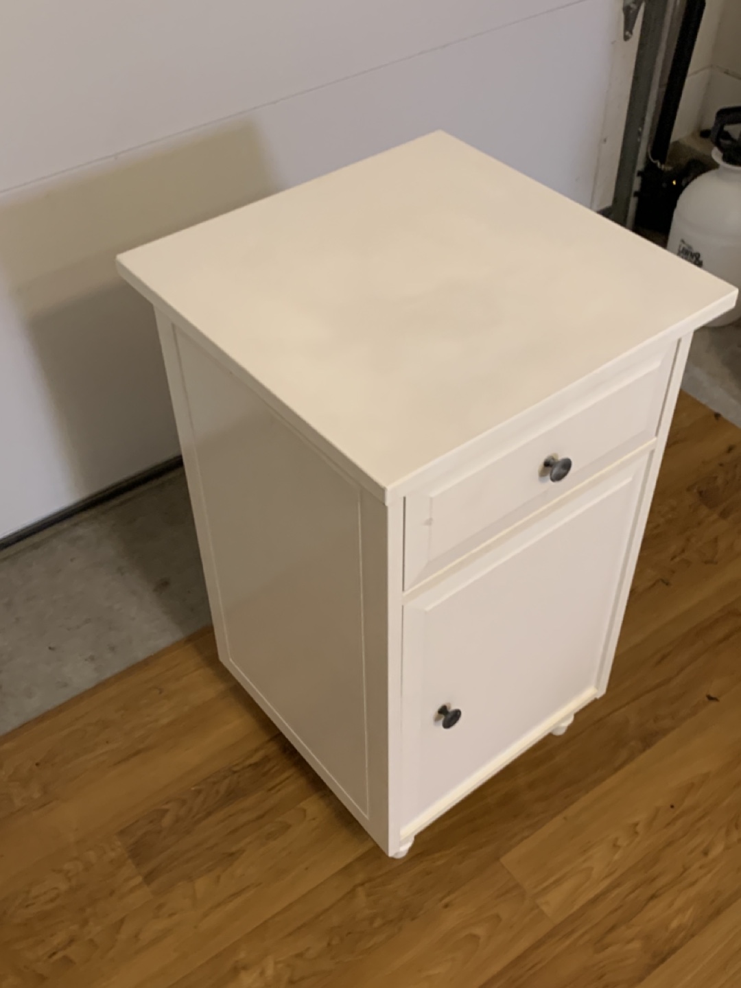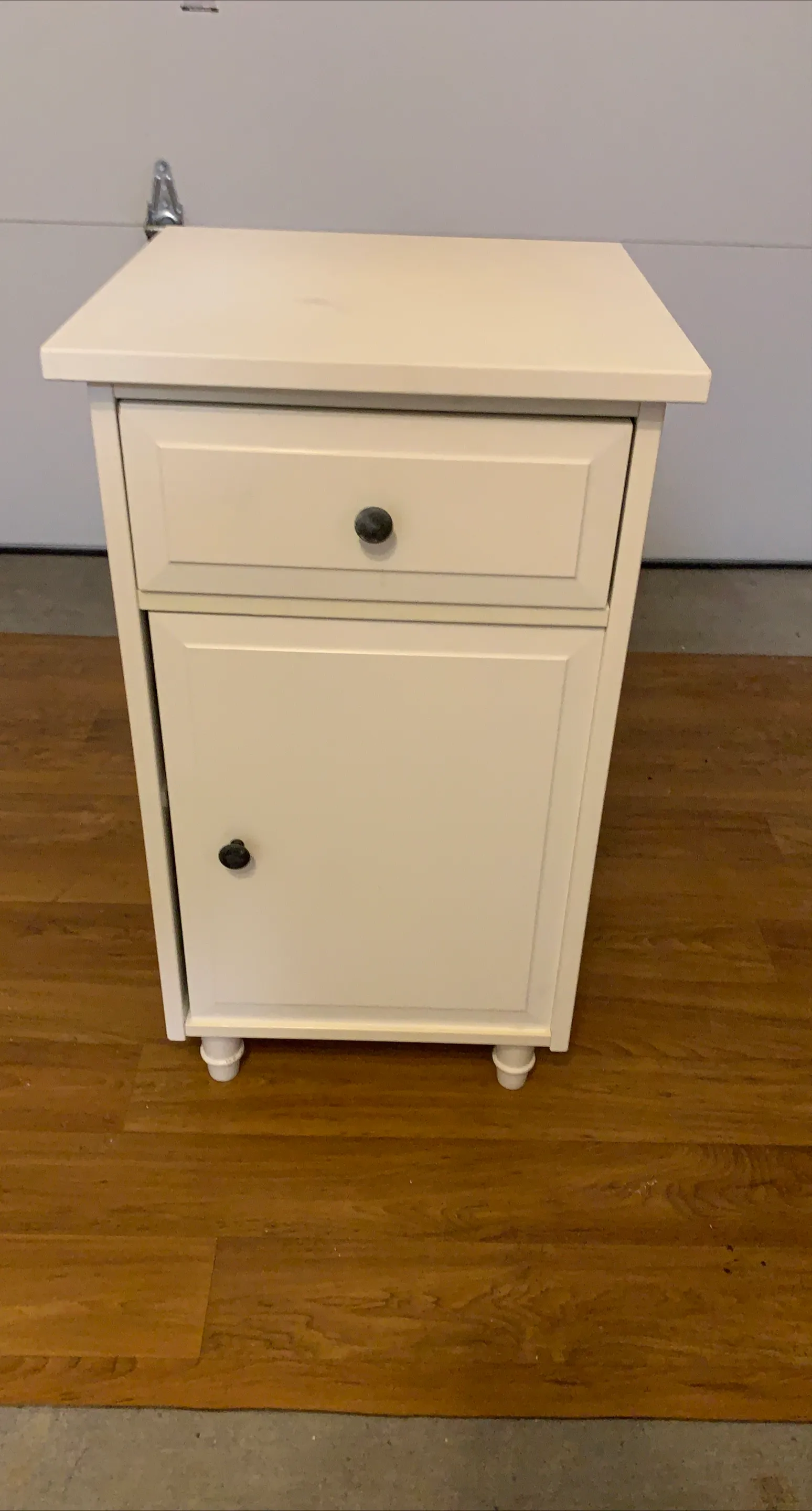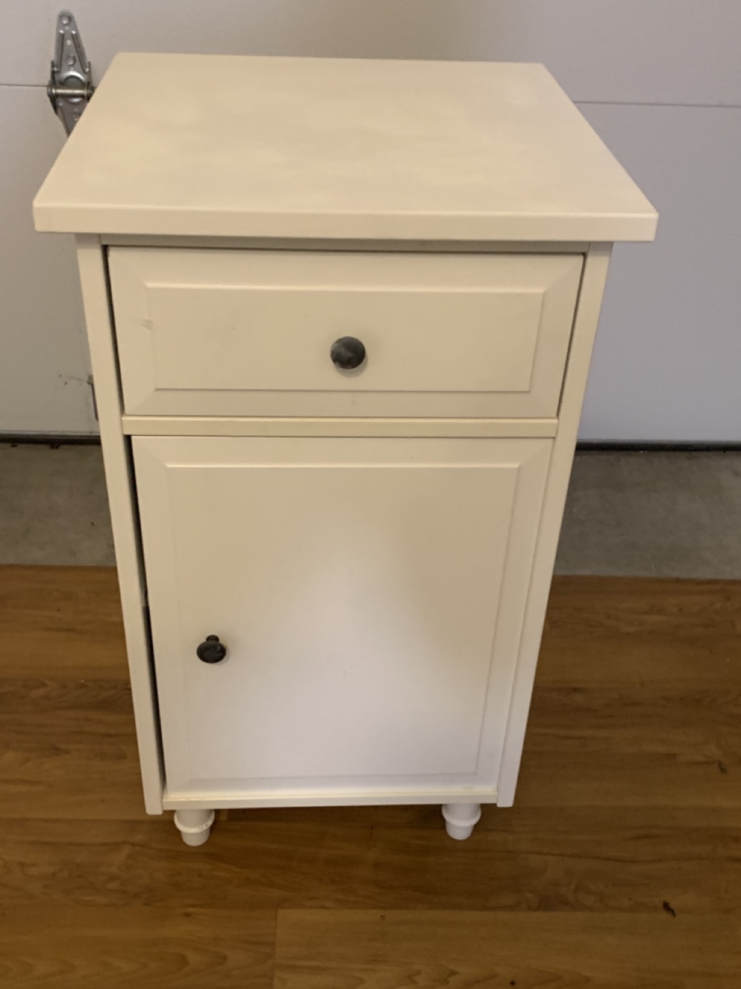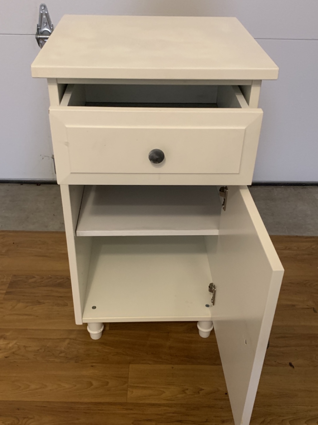 Here's a cute white nightstand! It has a drawer and a cabinet with a shelf inside, perfect for storing your bedside essentials