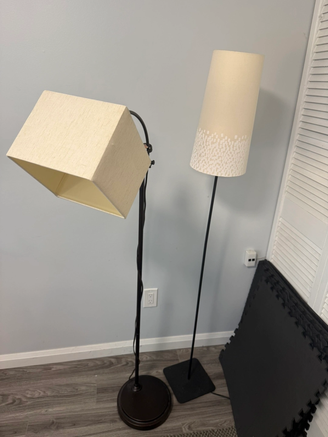 Two floor lamps for sale! One has a square shade and the other has a cylindrical shade with a patterned design near the bottom. Both have a black metal stand and base. Great for adding some extra light to any room