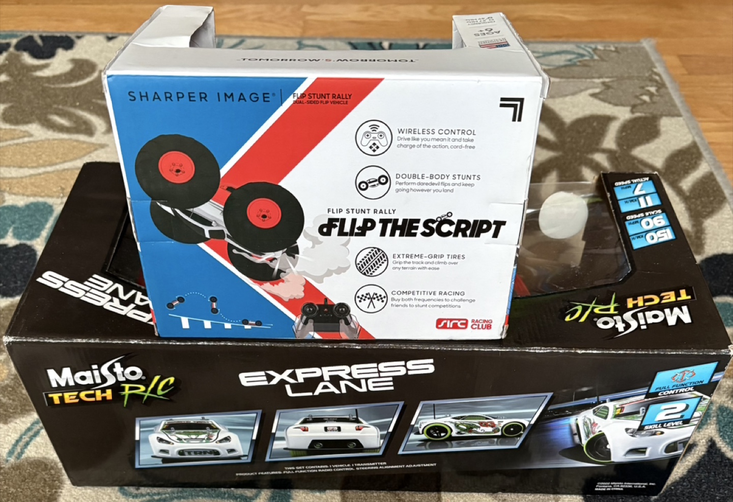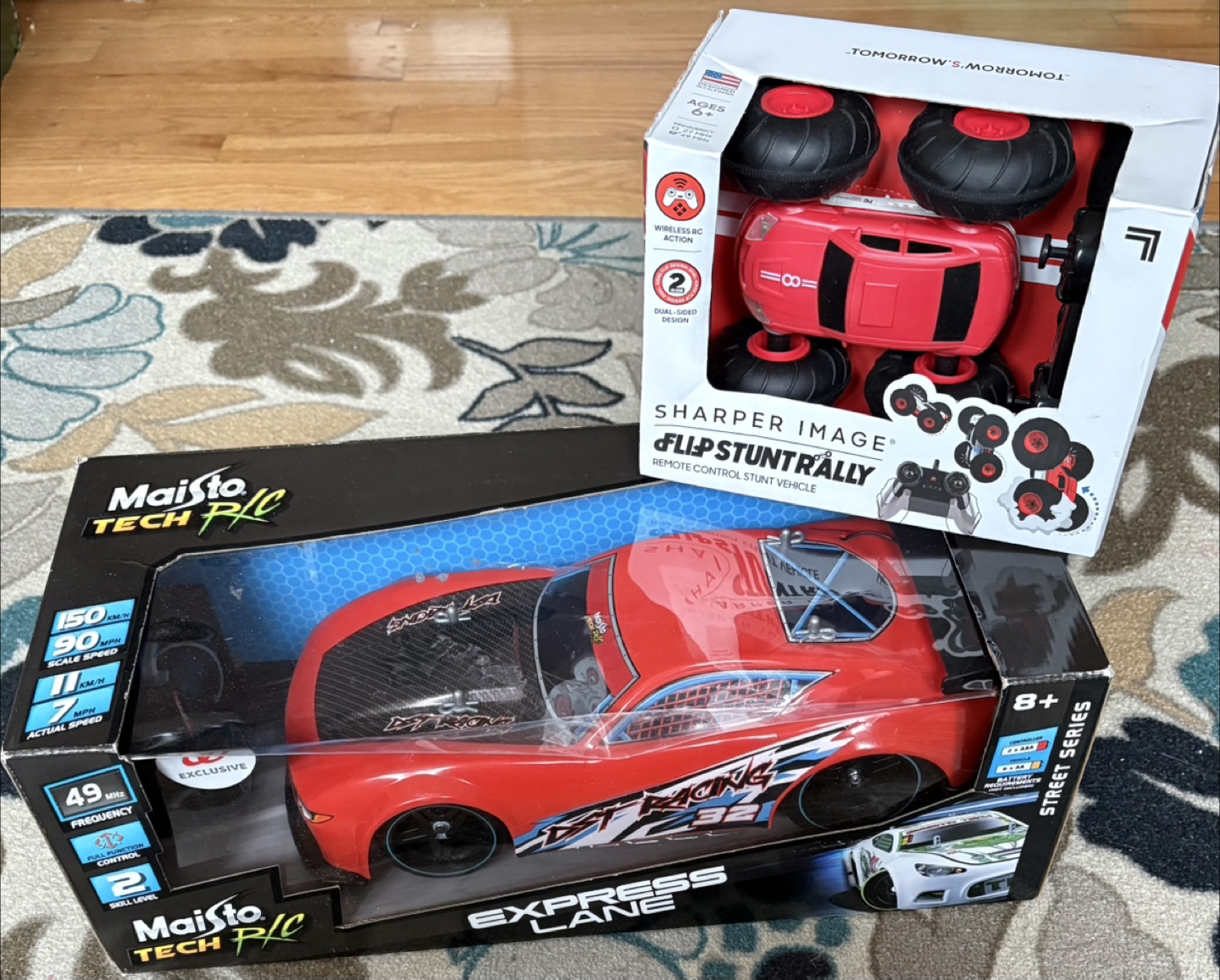 Brand new, Sharper Image Flip Stunt Rally remote control stunt vehicle and a Maisto Tech RC Express Lane car. Both come with their original boxes.
