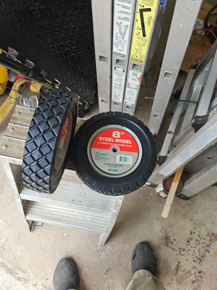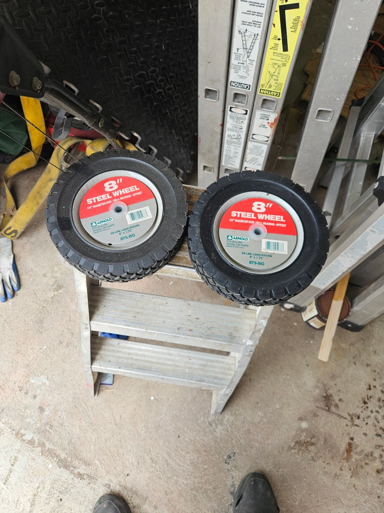 Selling a set of two Arnold 8" steel wheels! These wheels are 1/2" quarter hole bearing offset and have a 80 Lbs load rating. Great for various projects or replacements
