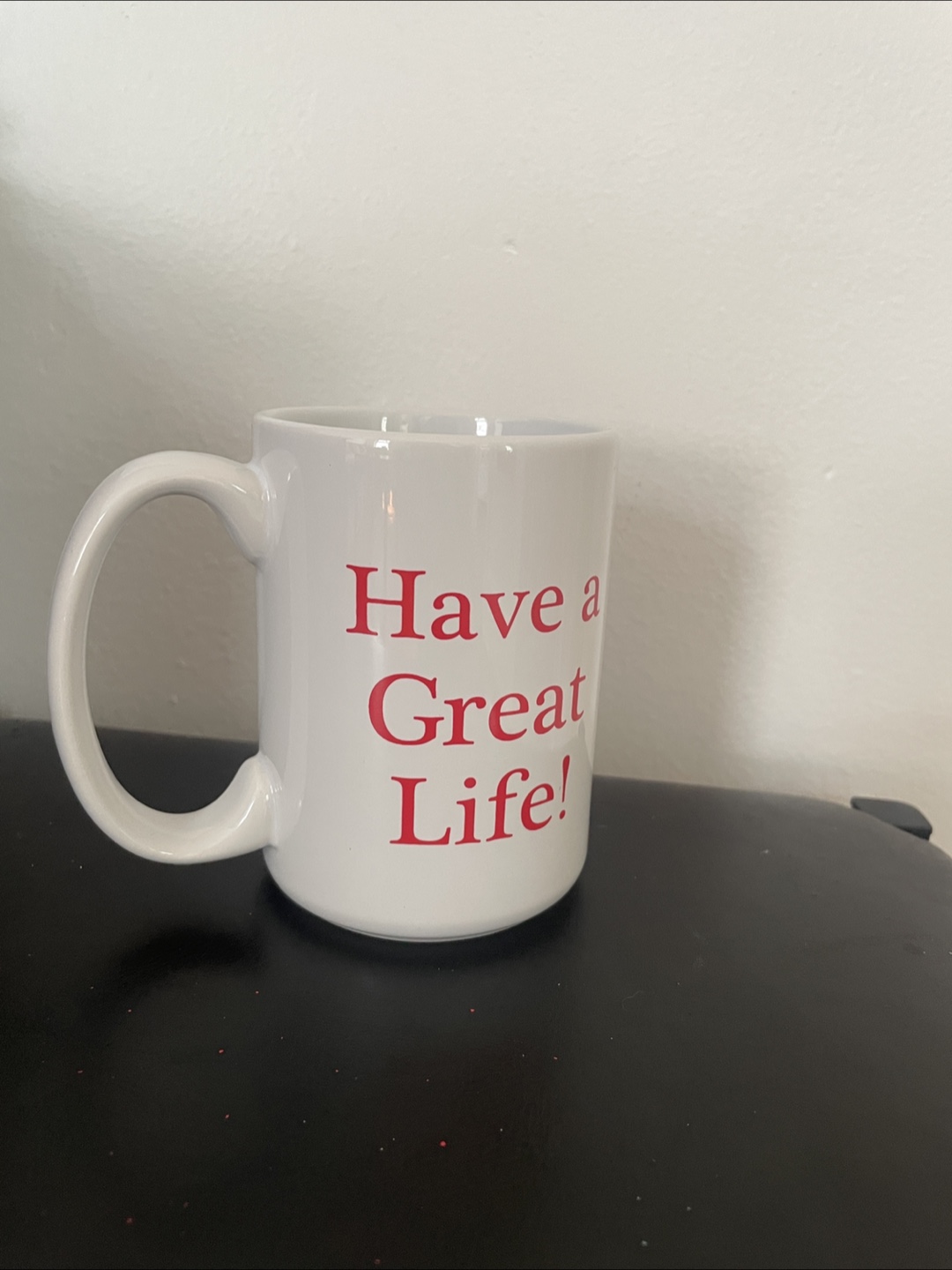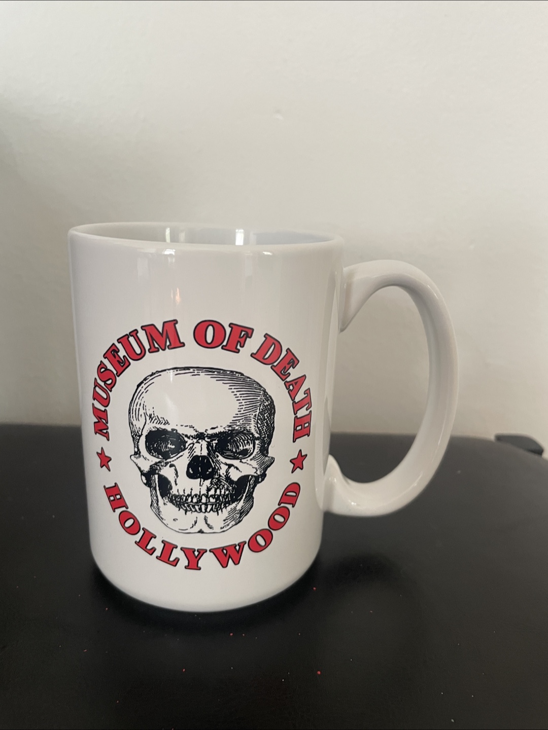 I'm selling a mug from the Museum of Death in Hollywood. It's white with red lettering and a skull design. It says 'Have a Great Life!' on the other side.