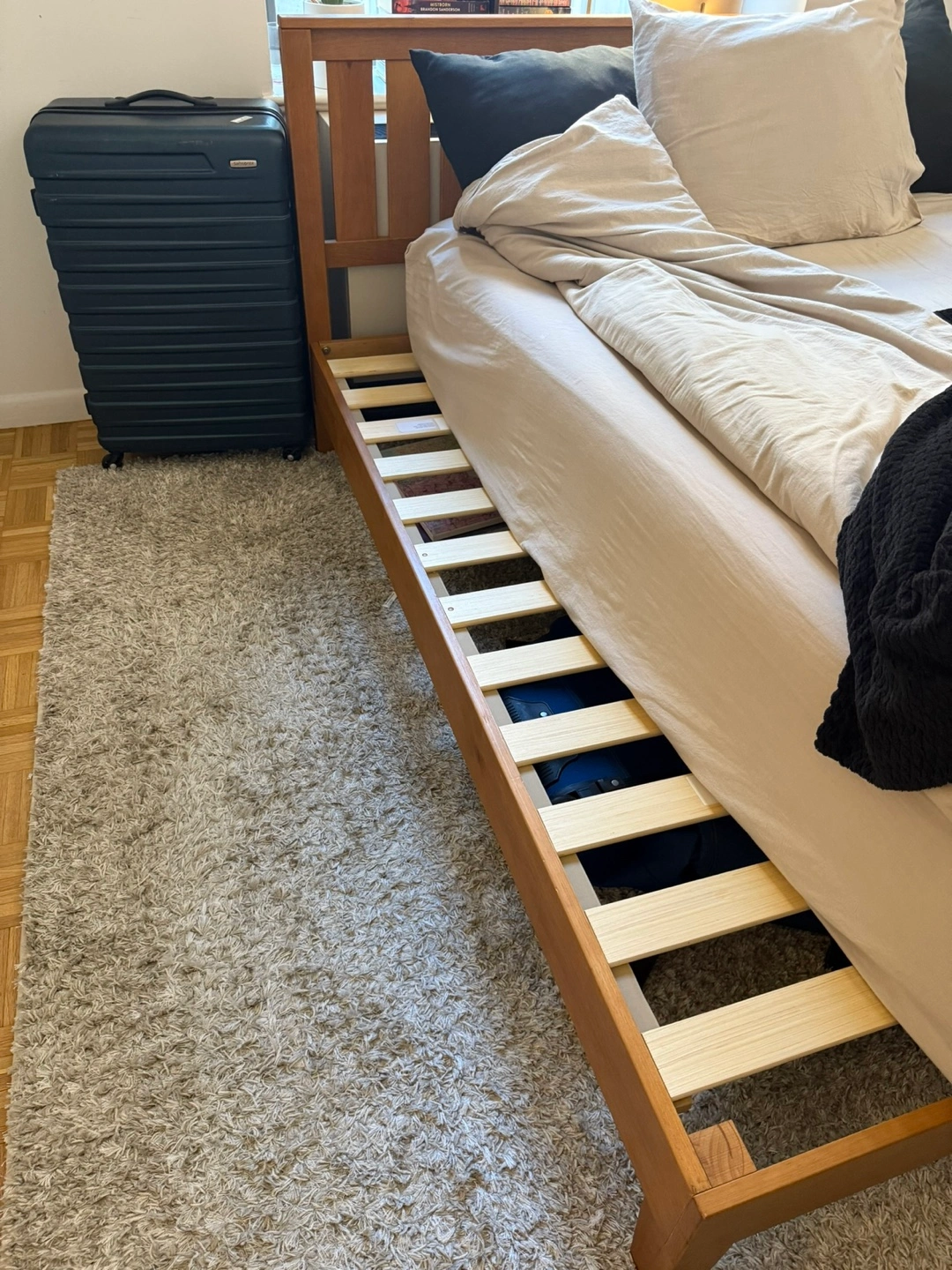 Buy & SellWooden Bed FrameWooden Bed Frame$150Selling a wooden bed frame! It's in great condition and ready for a new home. Perfect for adding a touch of warmth to your bedroom.WHERE TO MEET45 wallView MapSELLERverifiedLucasobFinancial District811 review1 chats·0 favorites·31 viewsSEND CHAT TO SELLERHi Lucasob! I’m interested in your listing.Hi Lucasob! I’m interested in your listing.Get the Karrot app to chatSign In to chat