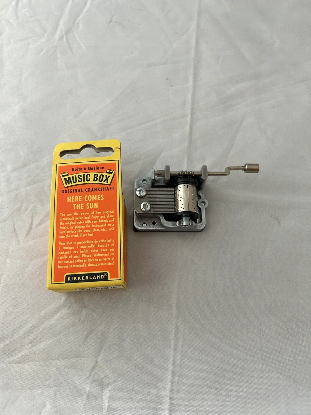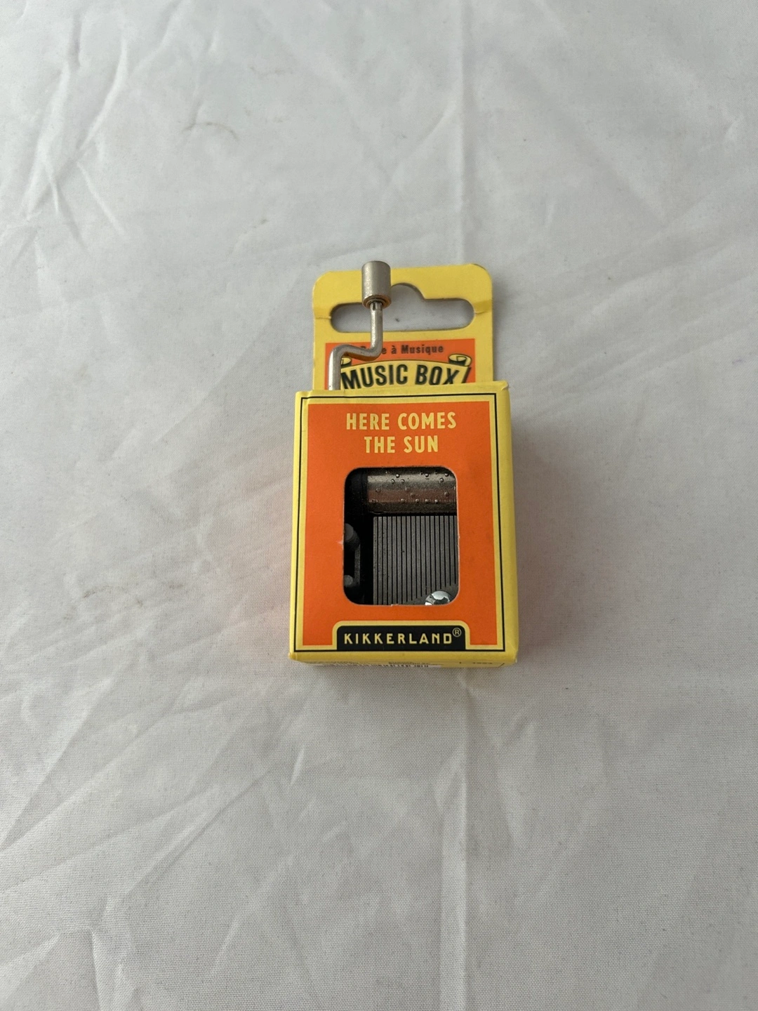 Cute Kikkerland music box that plays "Here Comes The Sun"! It's an original crankshaft music box still in original packaging. Great gift for any occasion!