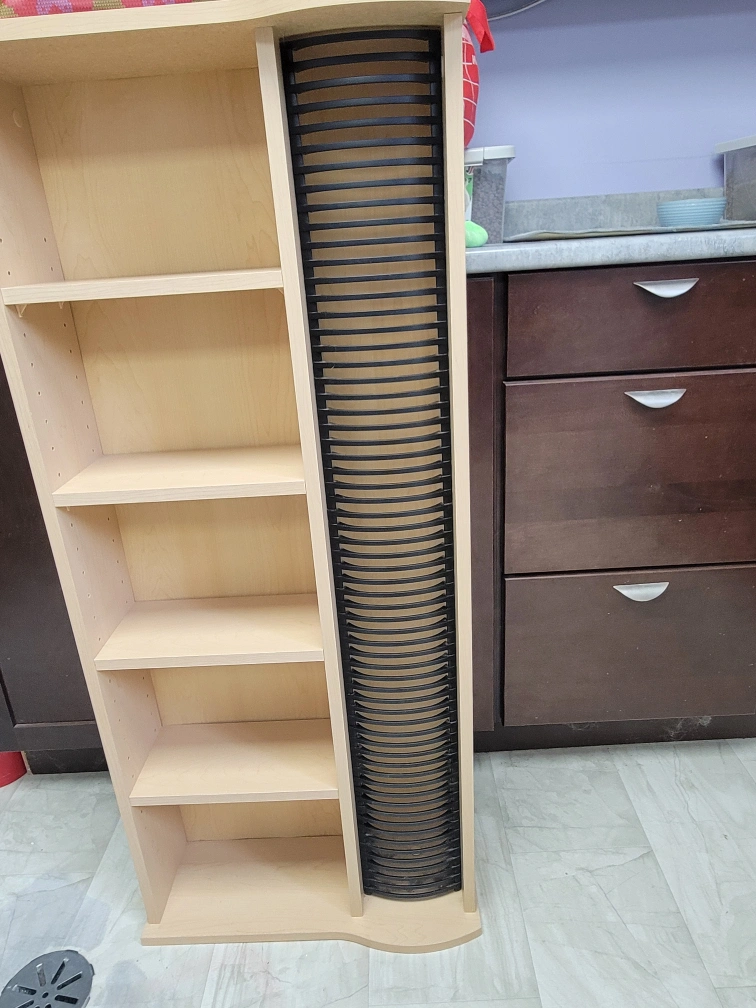 I'm selling a light wood CD/DVD storage shelf. It's in great shape and ready to organize your collection! It has a sleek design with shelves on one side and a unique vertical storage section for discs on the other. Perfect for any media room or living space