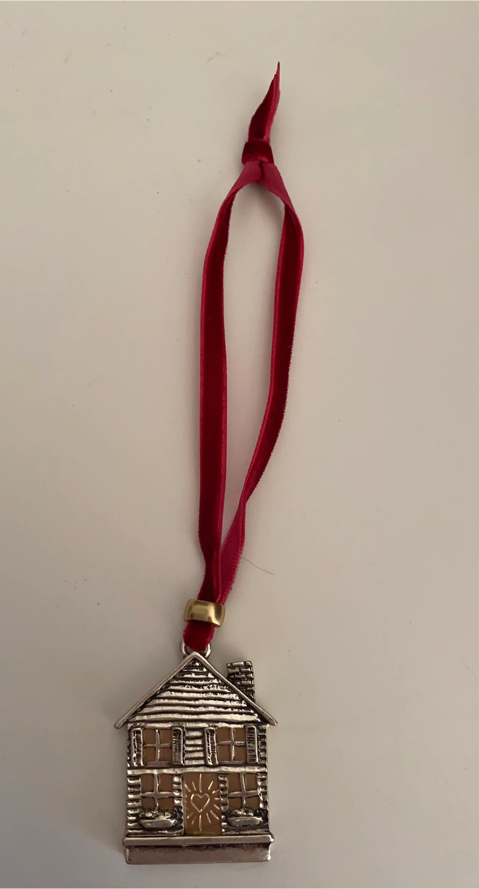 This is a decorative house ornament. It hangs from a red velvet ribbon. The house is silver-toned with gold-colored windows.