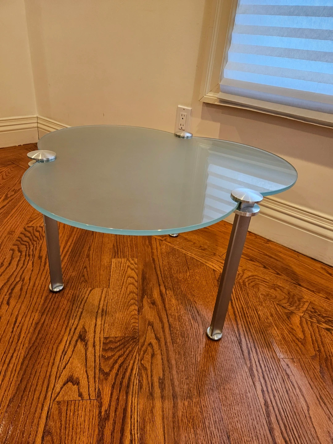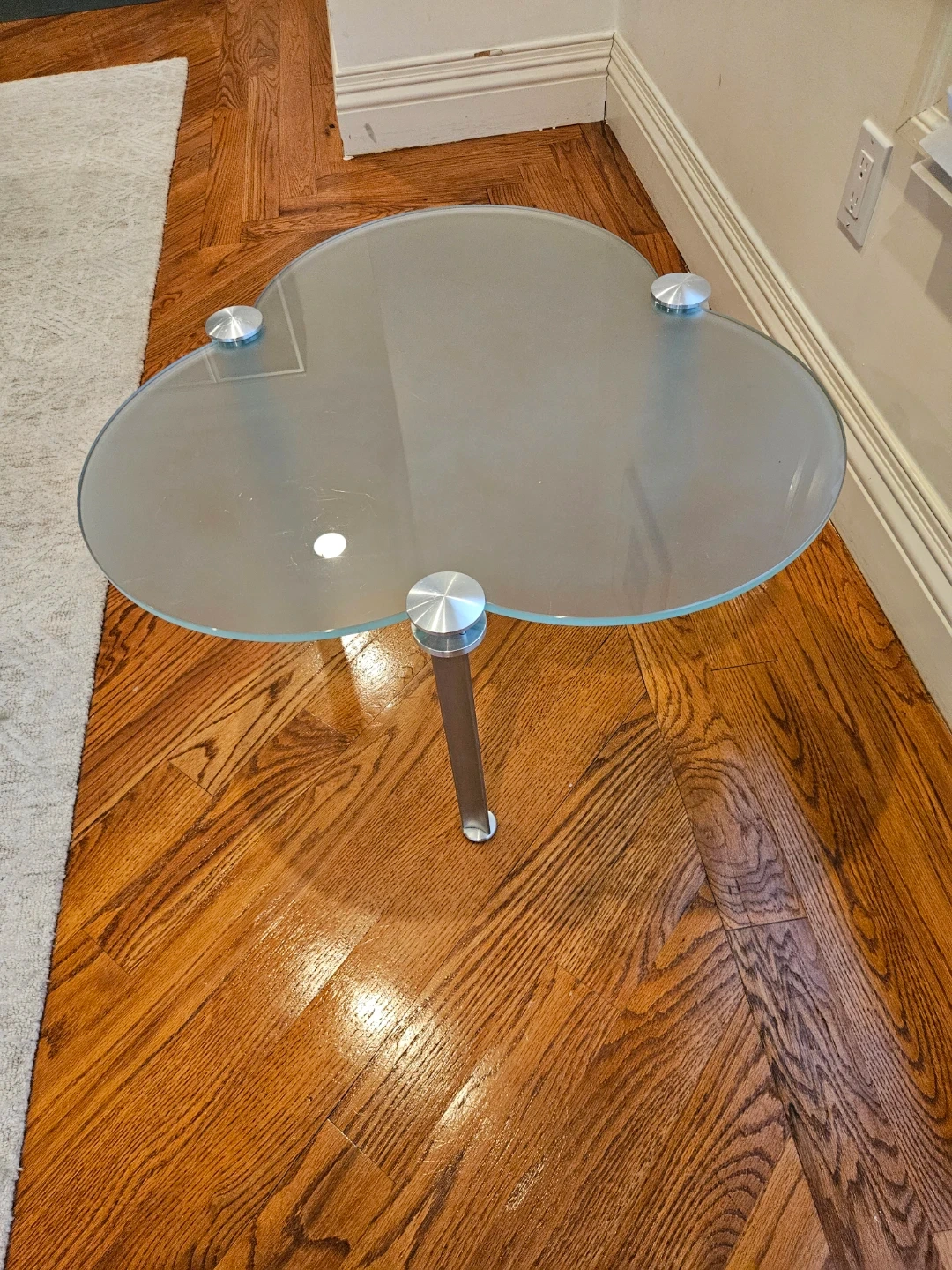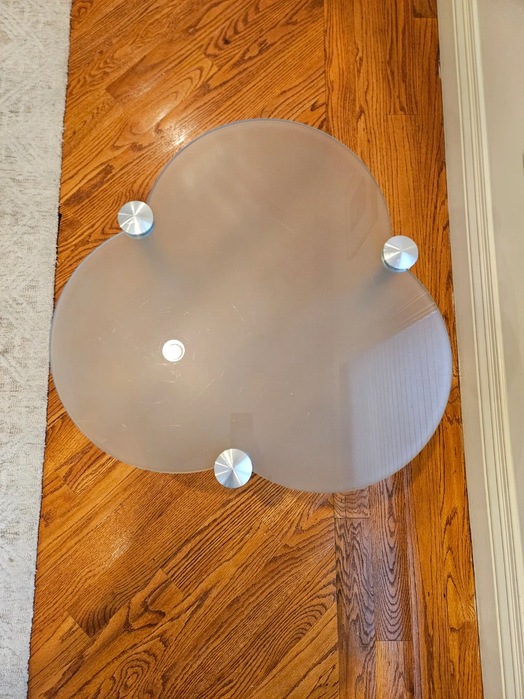 Unique clover-shaped accent table with a frosted glass top. It's supported by three brushed metal legs. This piece adds a modern touch to any room!