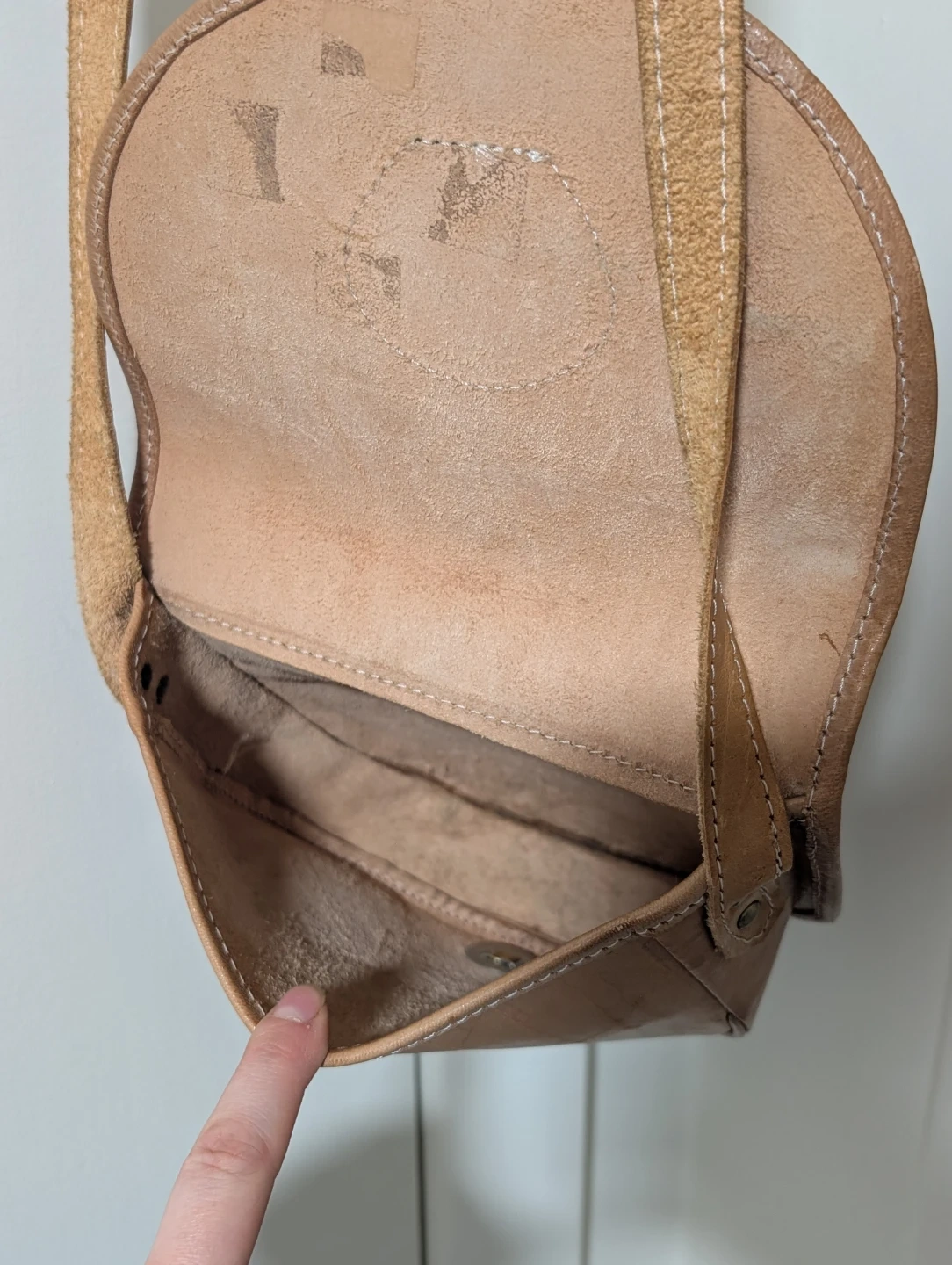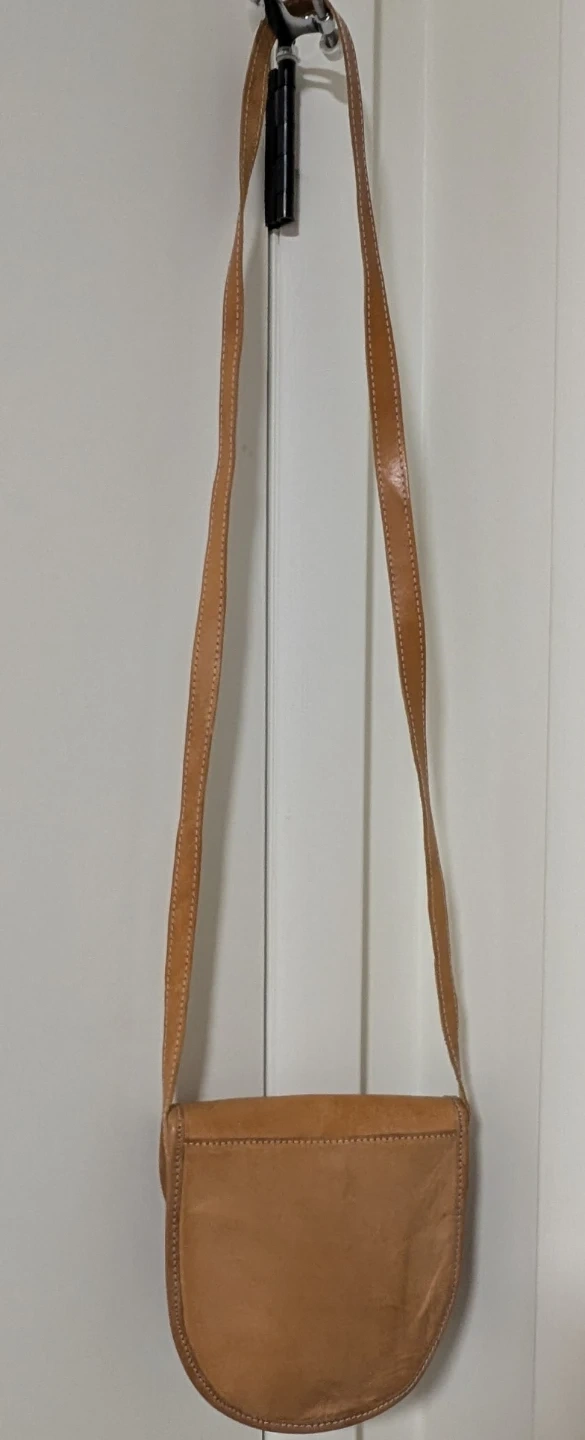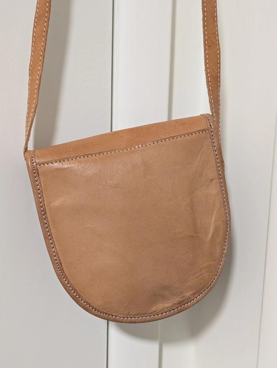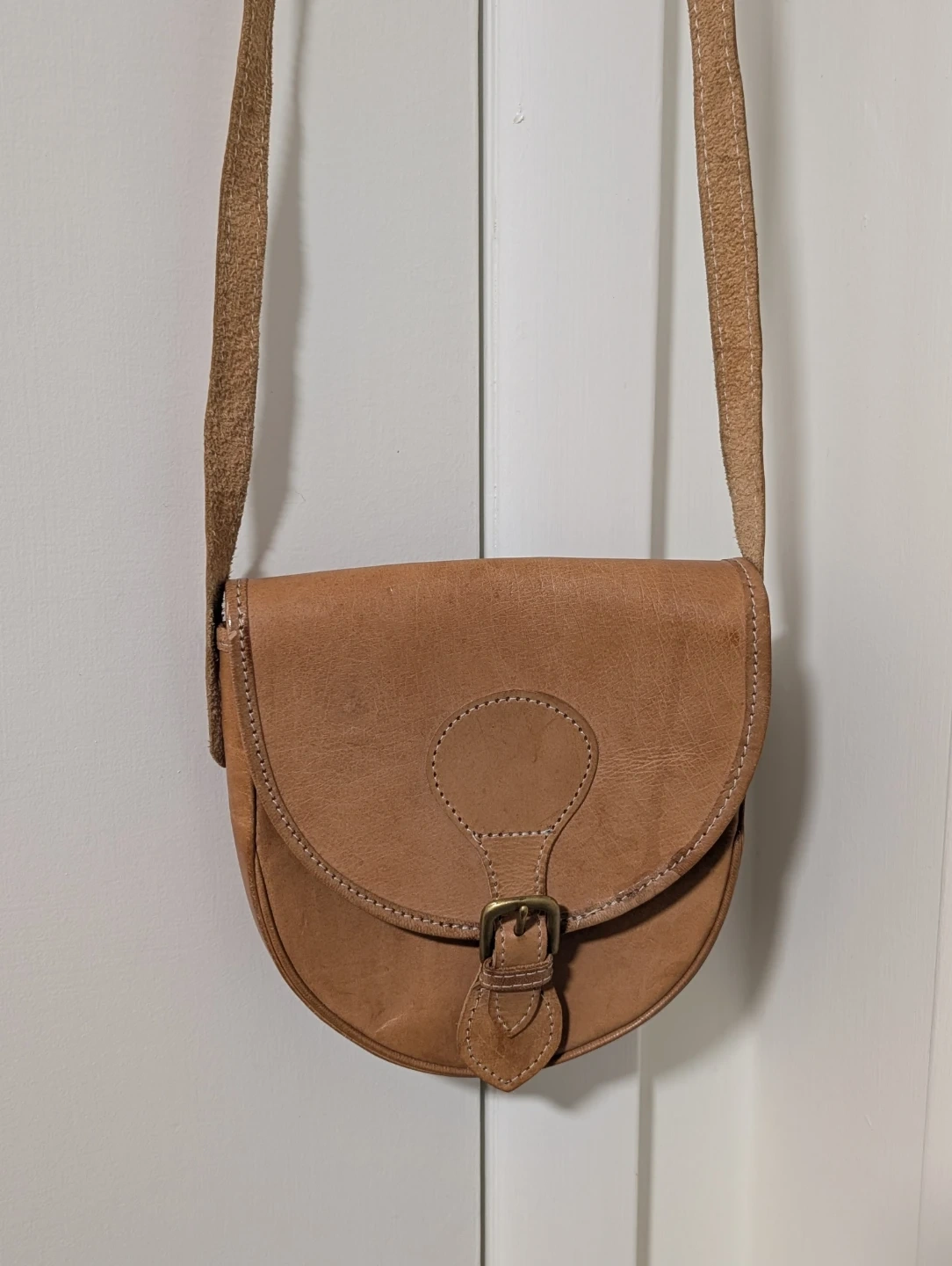 This is a tan leather saddle bag. It's made of genuine leather with a buckle closure. Small size, perfect for essentials.