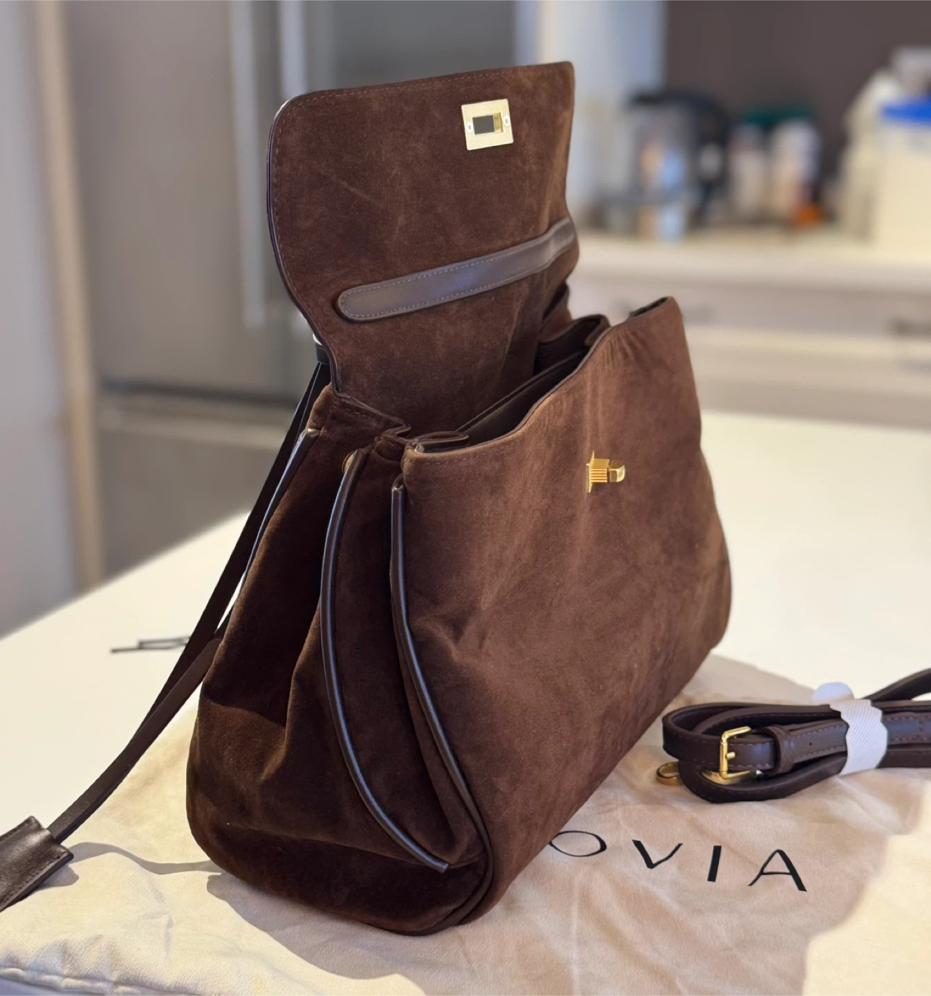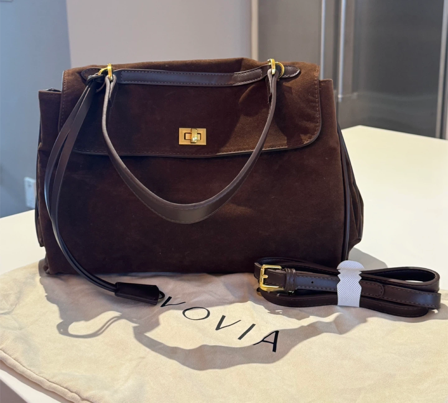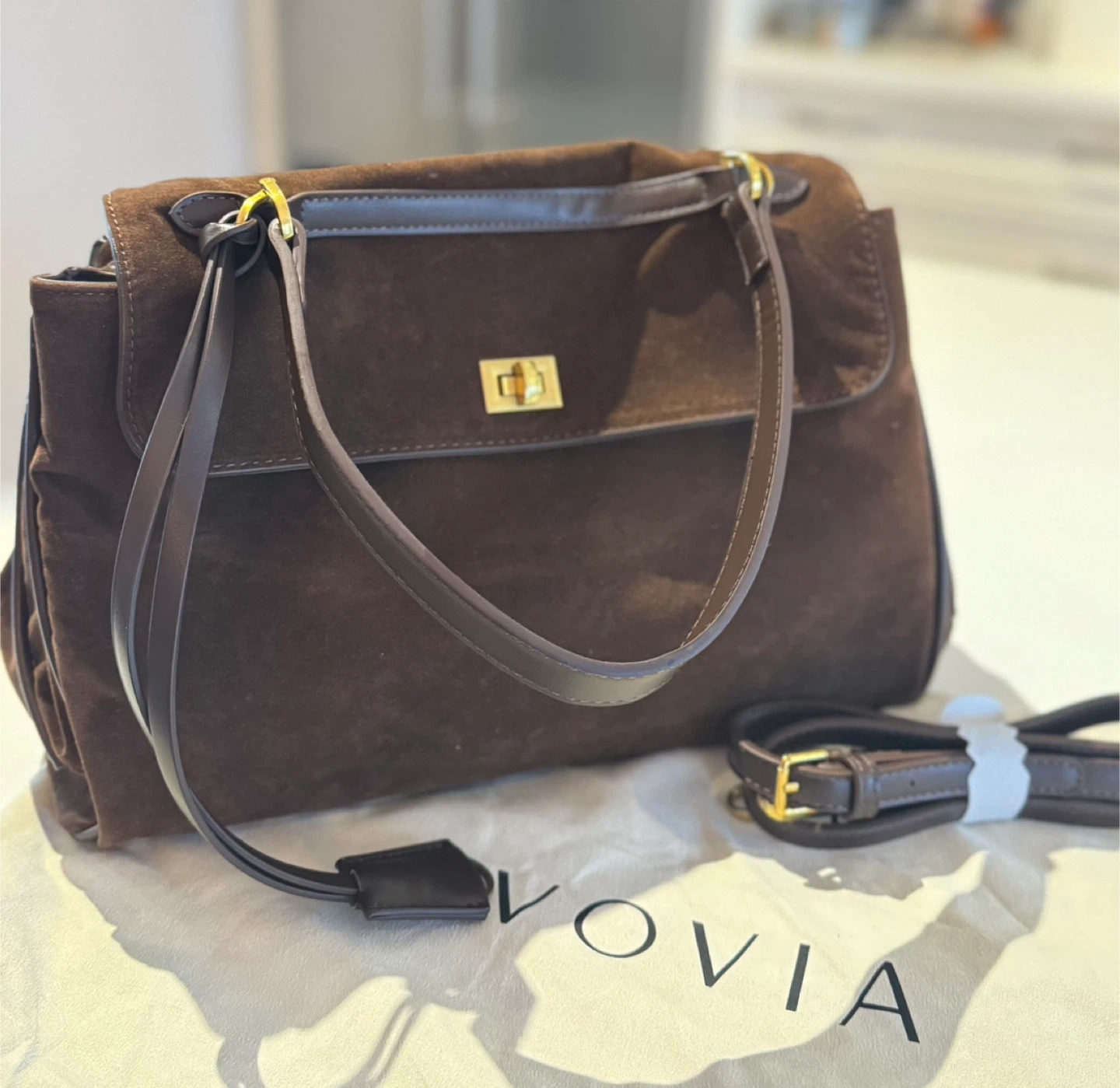 A stylish brown suede/vegan leather shoulder bag. It features a secure clasp closure and a detachable strap for versatile carrying options. The inside has 2 separate compartments for you to store your items, and the back has two panels that allow you to put in flat items.