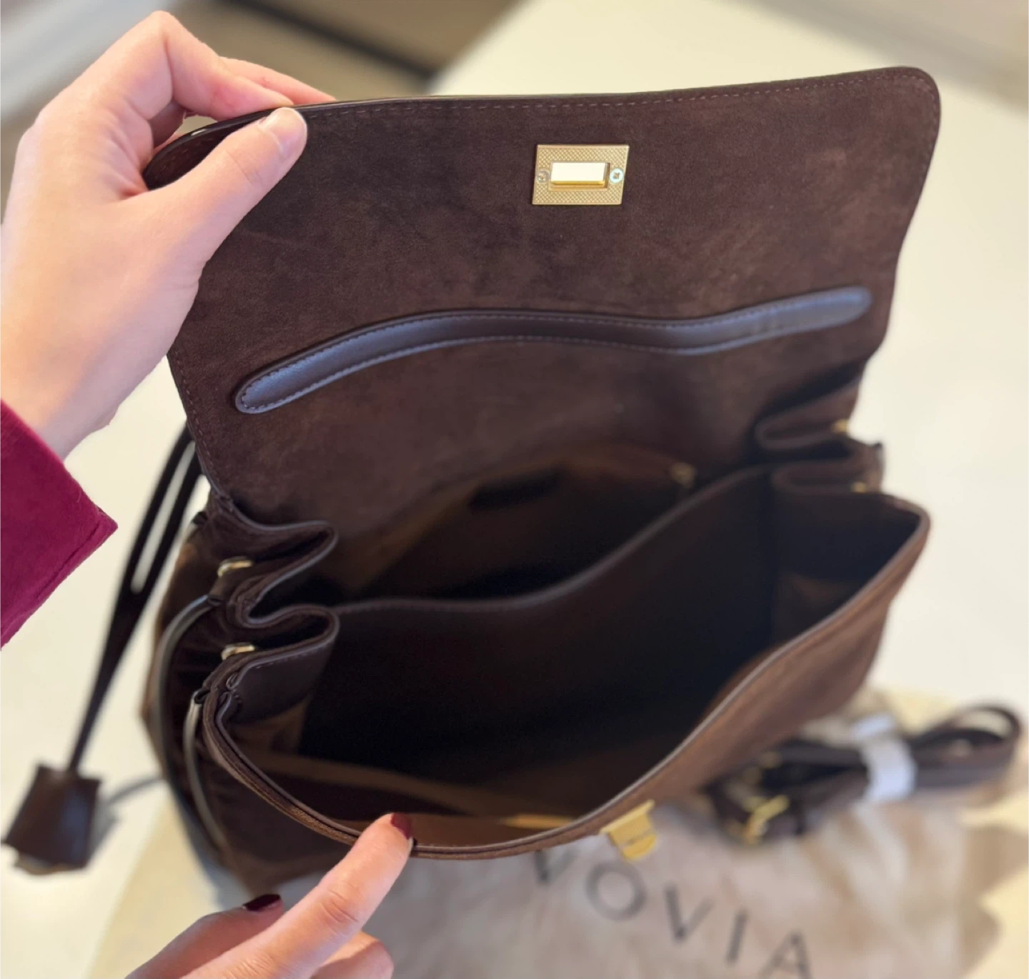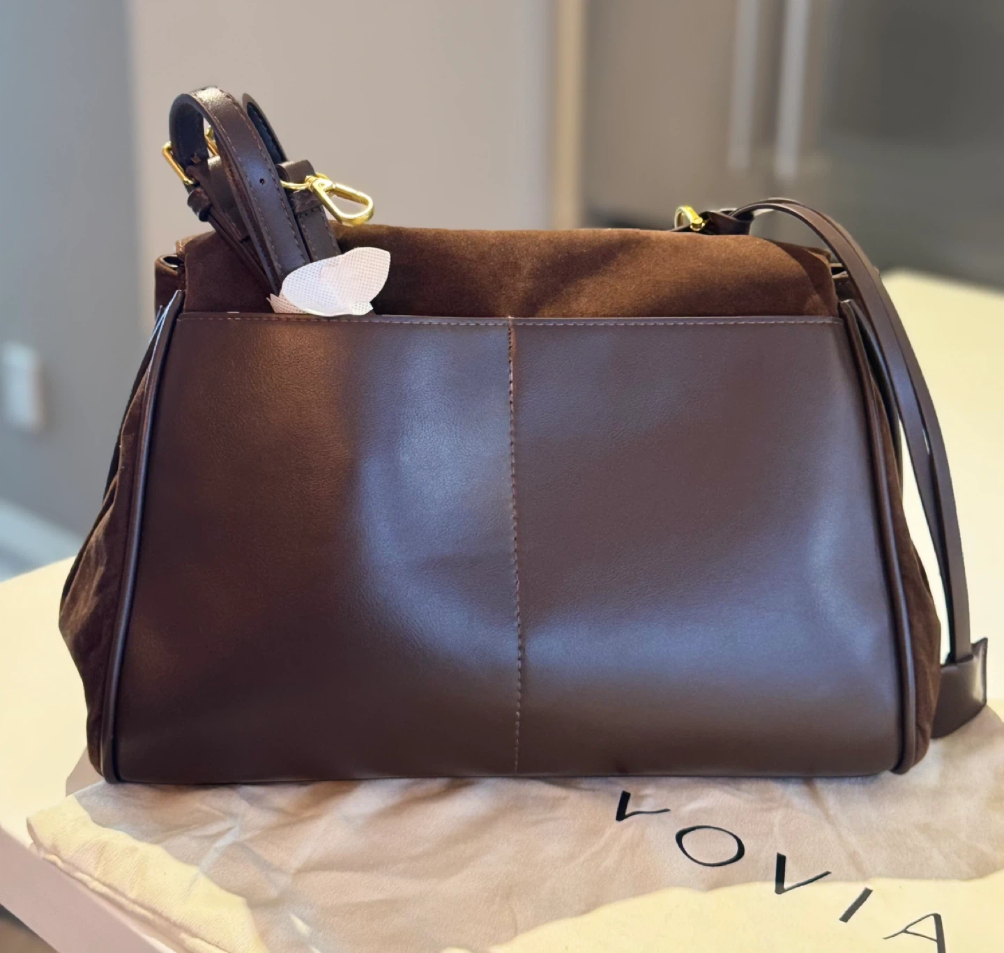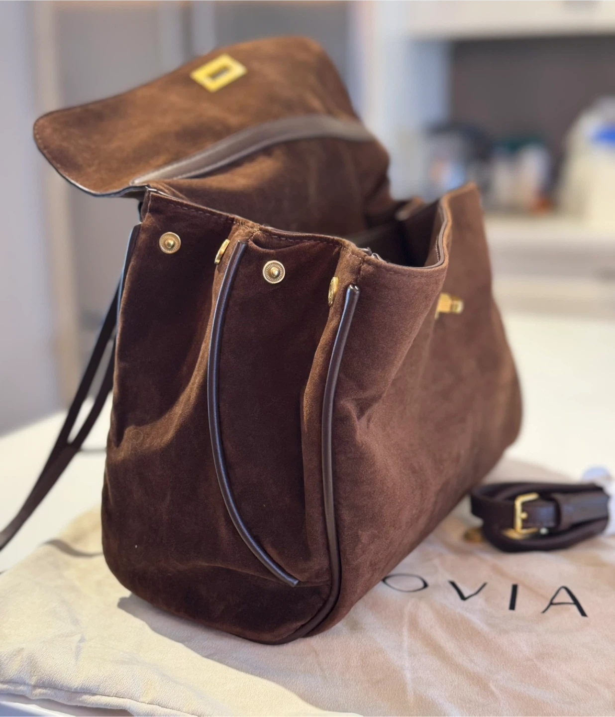 A stylish brown suede/vegan leather shoulder bag. It features a secure clasp closure and a detachable strap for versatile carrying options. The inside has 2 separate compartments for you to store your items, and the back has two panels that allow you to put in flat items.