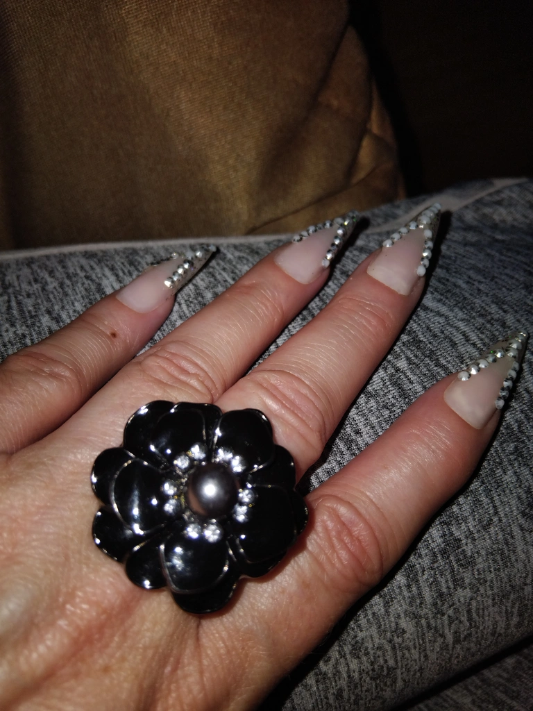 A lovely black flower ring with a pearl centre, surrounded by small crystals. It's a beautiful statement piece!