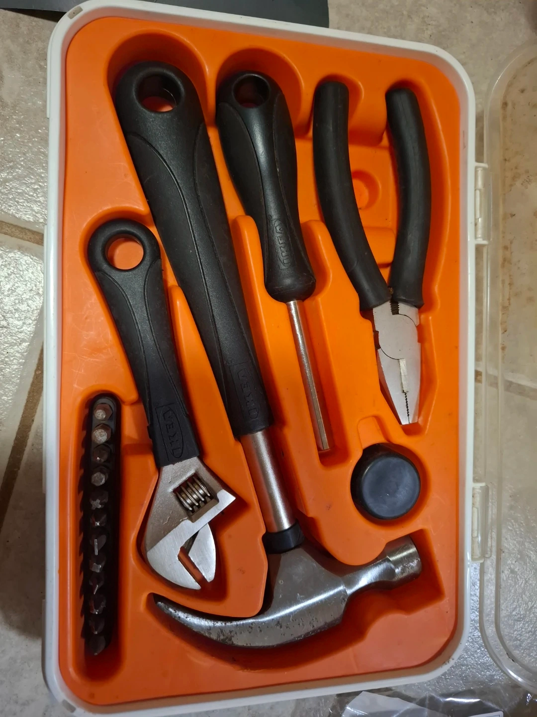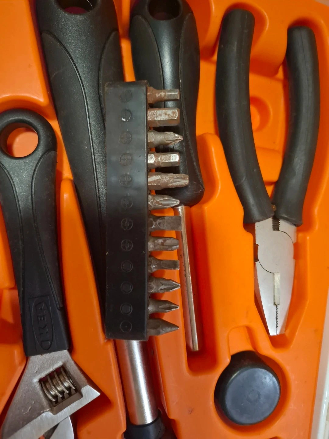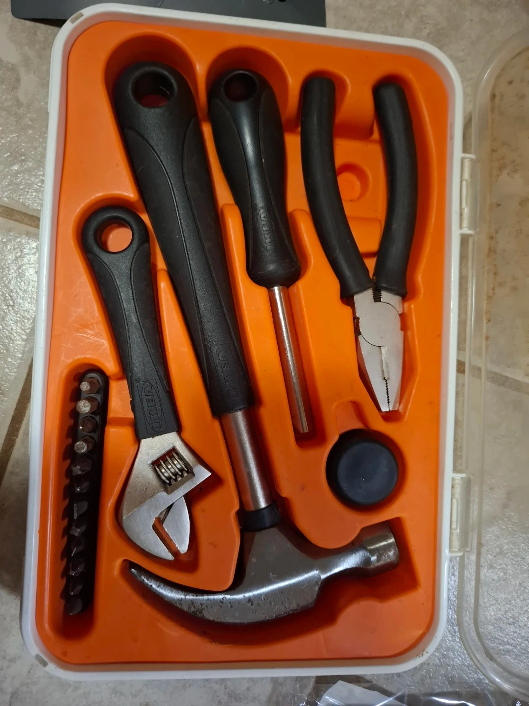 Selling an IKEA tool kit that includes a variety of essential tools. The set comes in a convenient orange and white case, perfect for keeping everything organized. Includes a hammer, adjustable wrench, screwdriver, pliers, and a selection of bits. Great for small repairs and projects around the house!