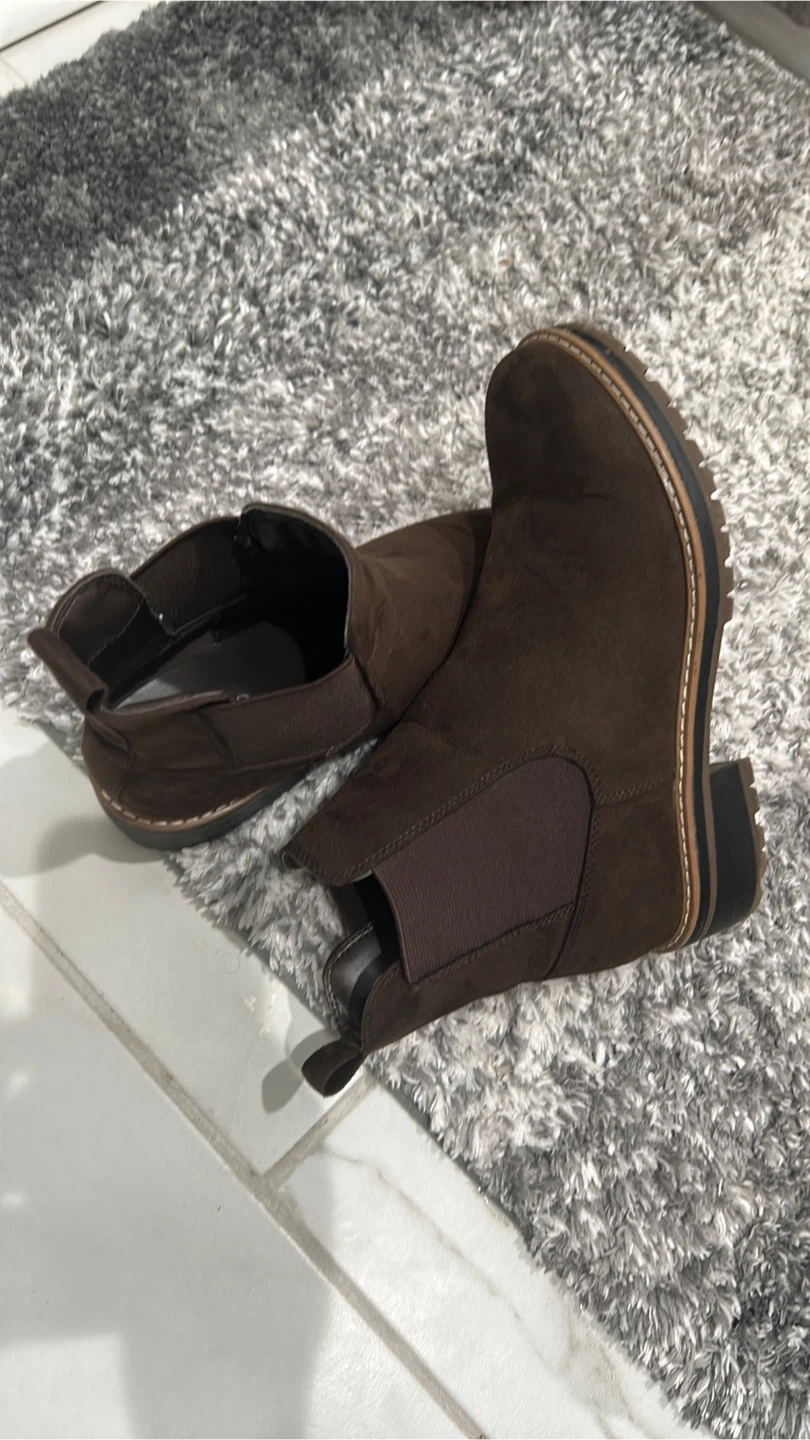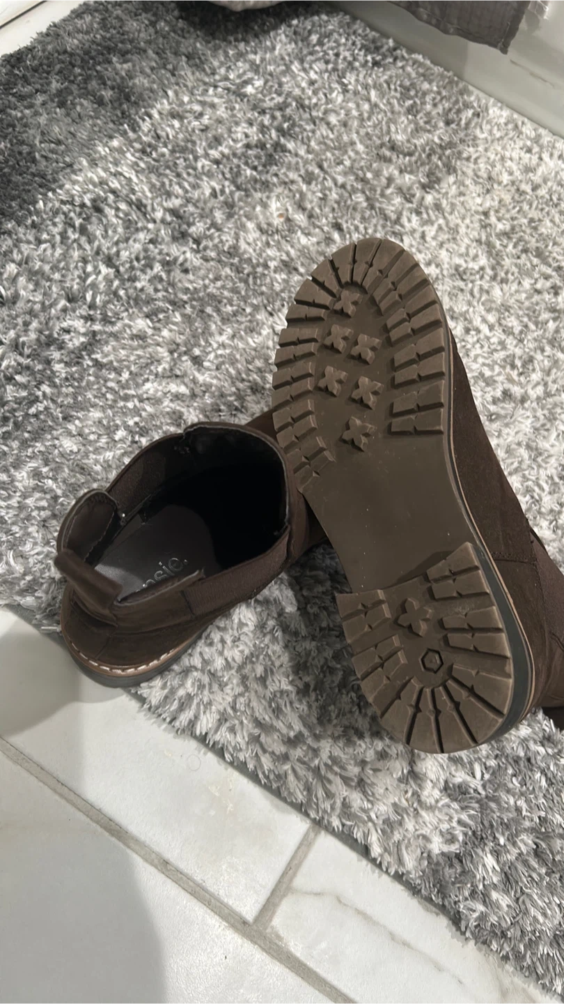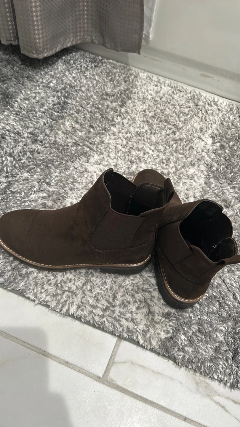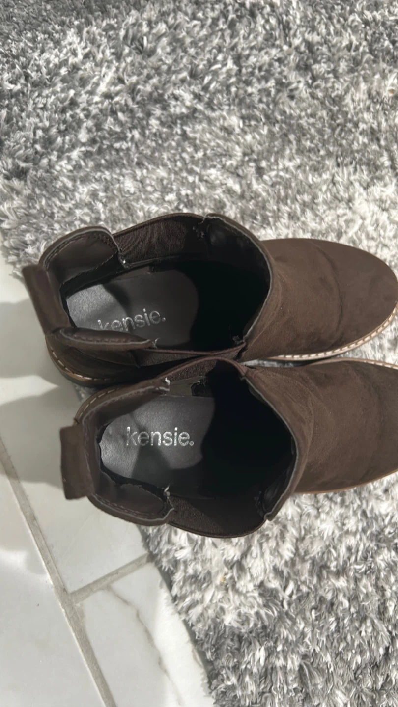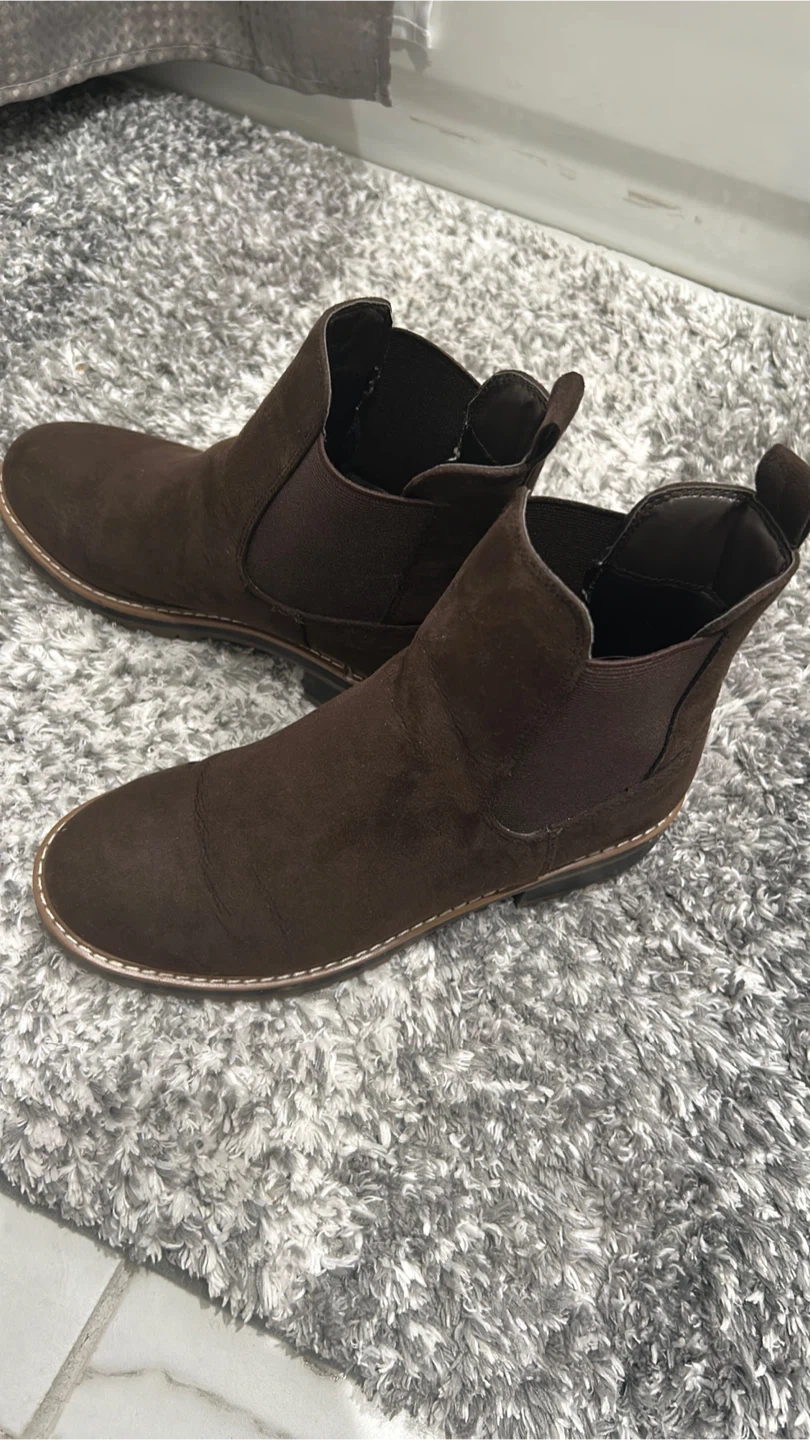 These Kensie Chelsea boots are a rich brown color and made of suede. They feature elastic side panels for easy on and off. The lug sole provides good traction.