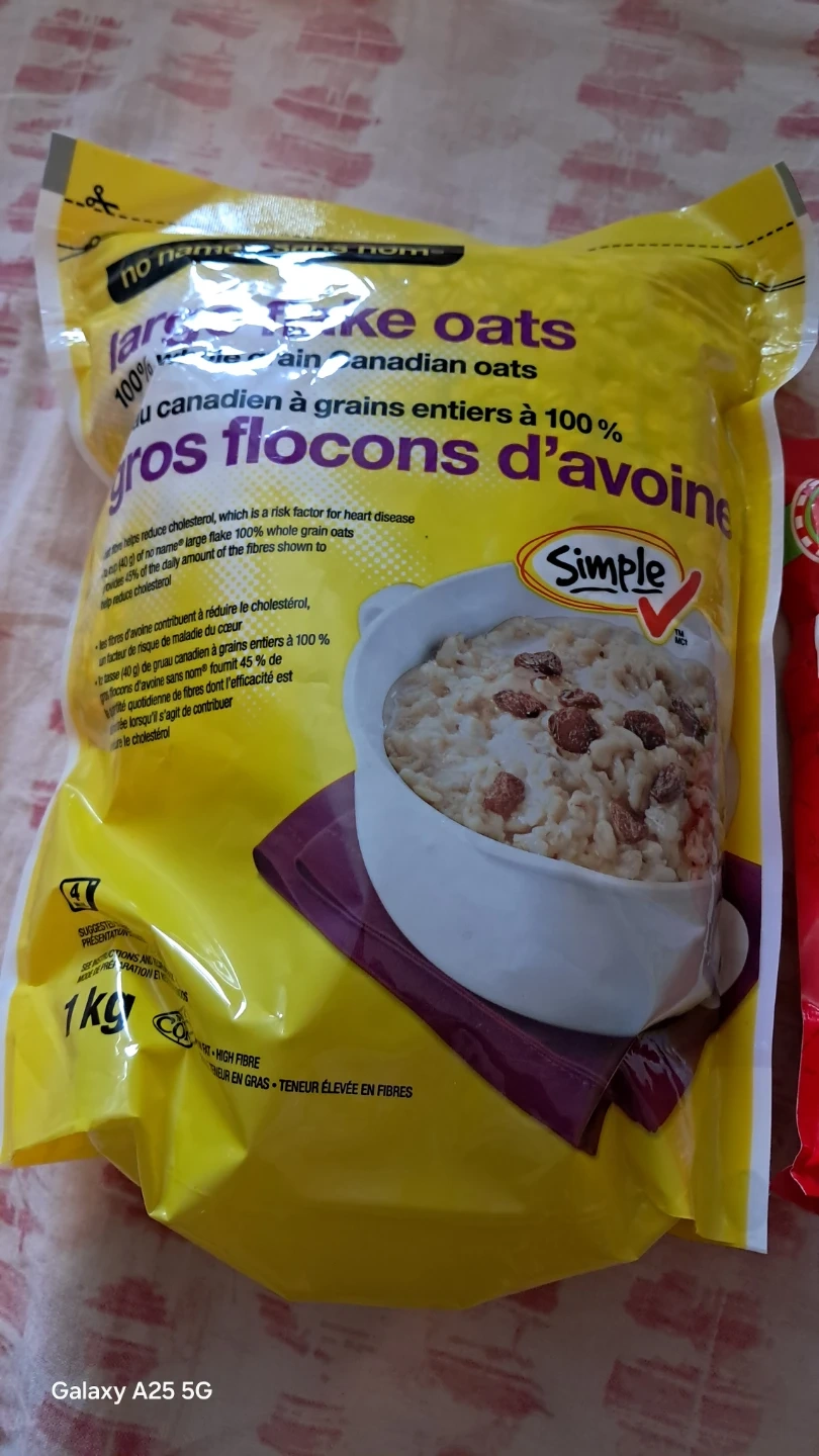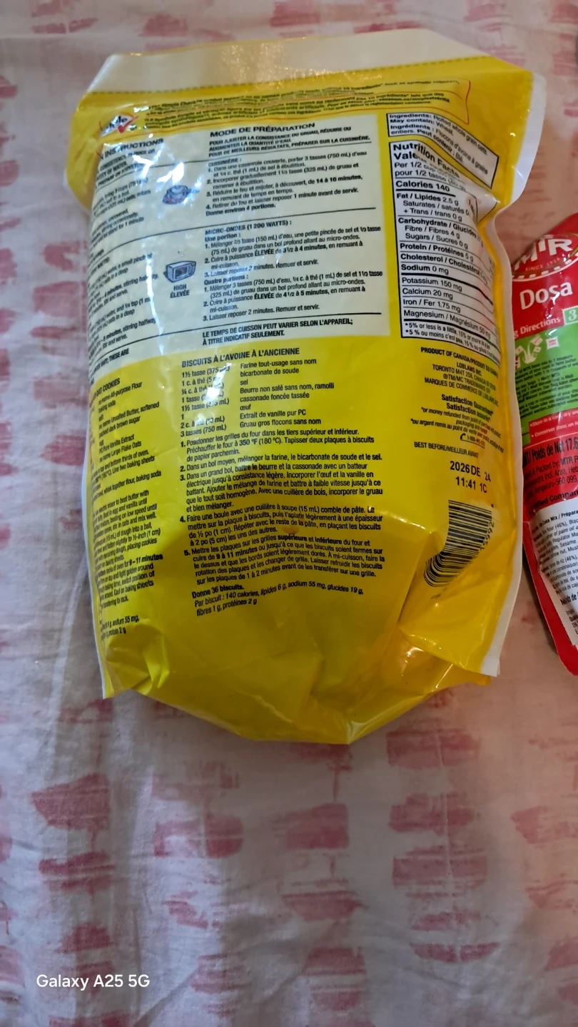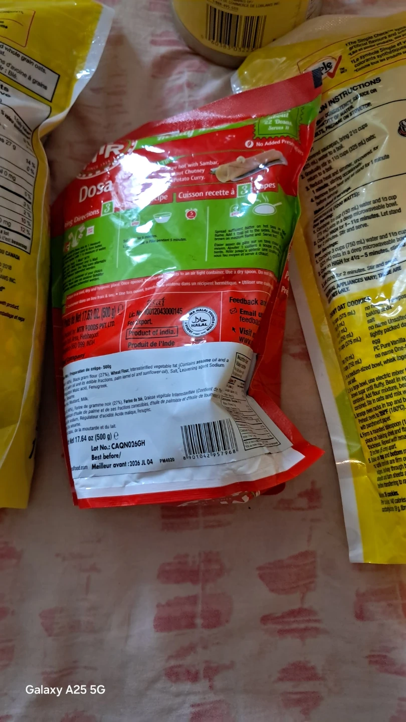 Two bags of Simple & Delicious large flake and one minute Canadian oats. Also includes MTR Foods Dosa mix. Best before dates are 2026-01-01 for the oats and 2024-07-01 for the dosa mix. Perfect for quick breakfasts or delicious meals!