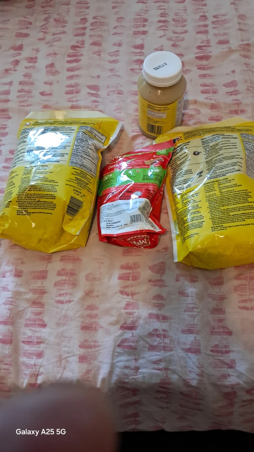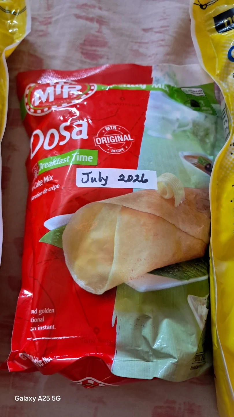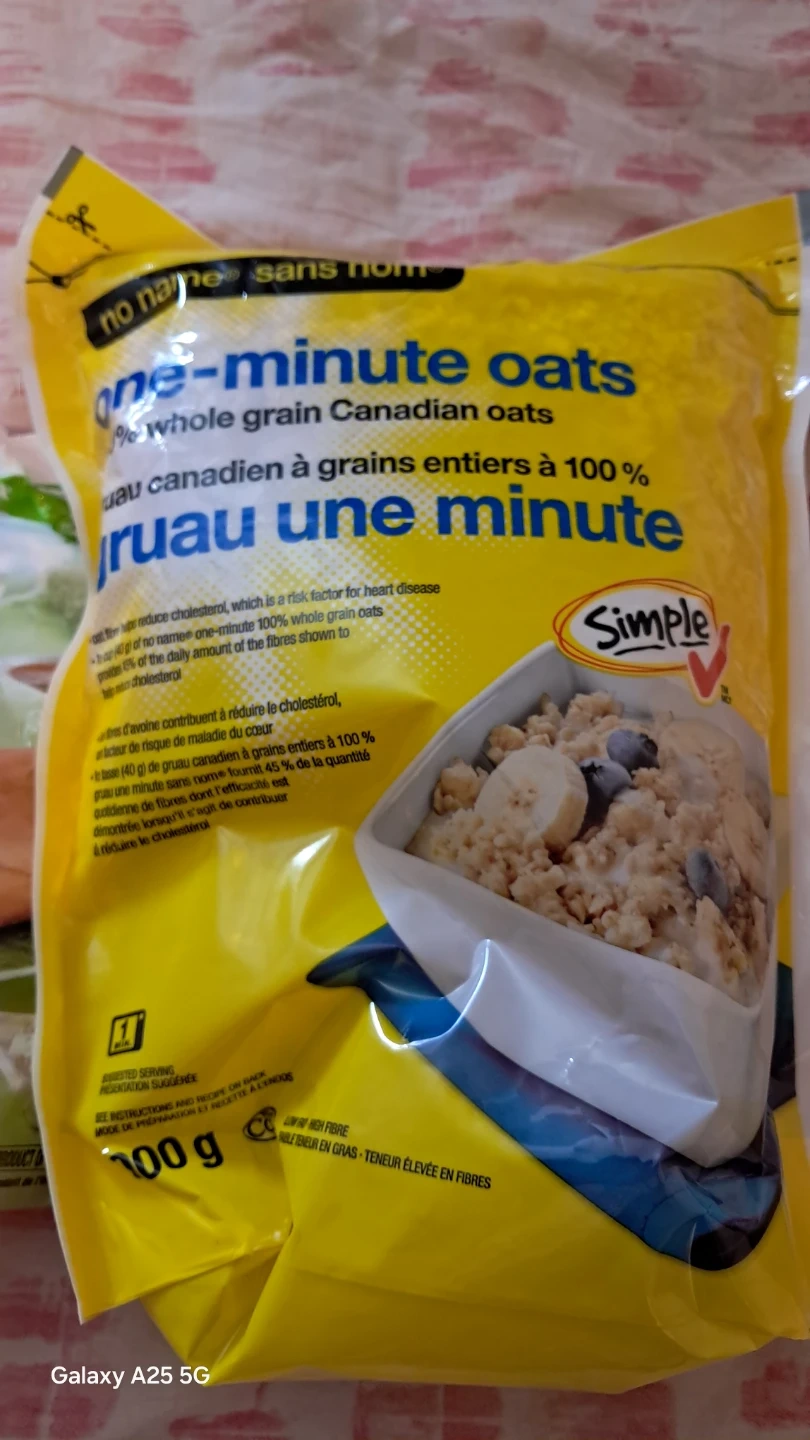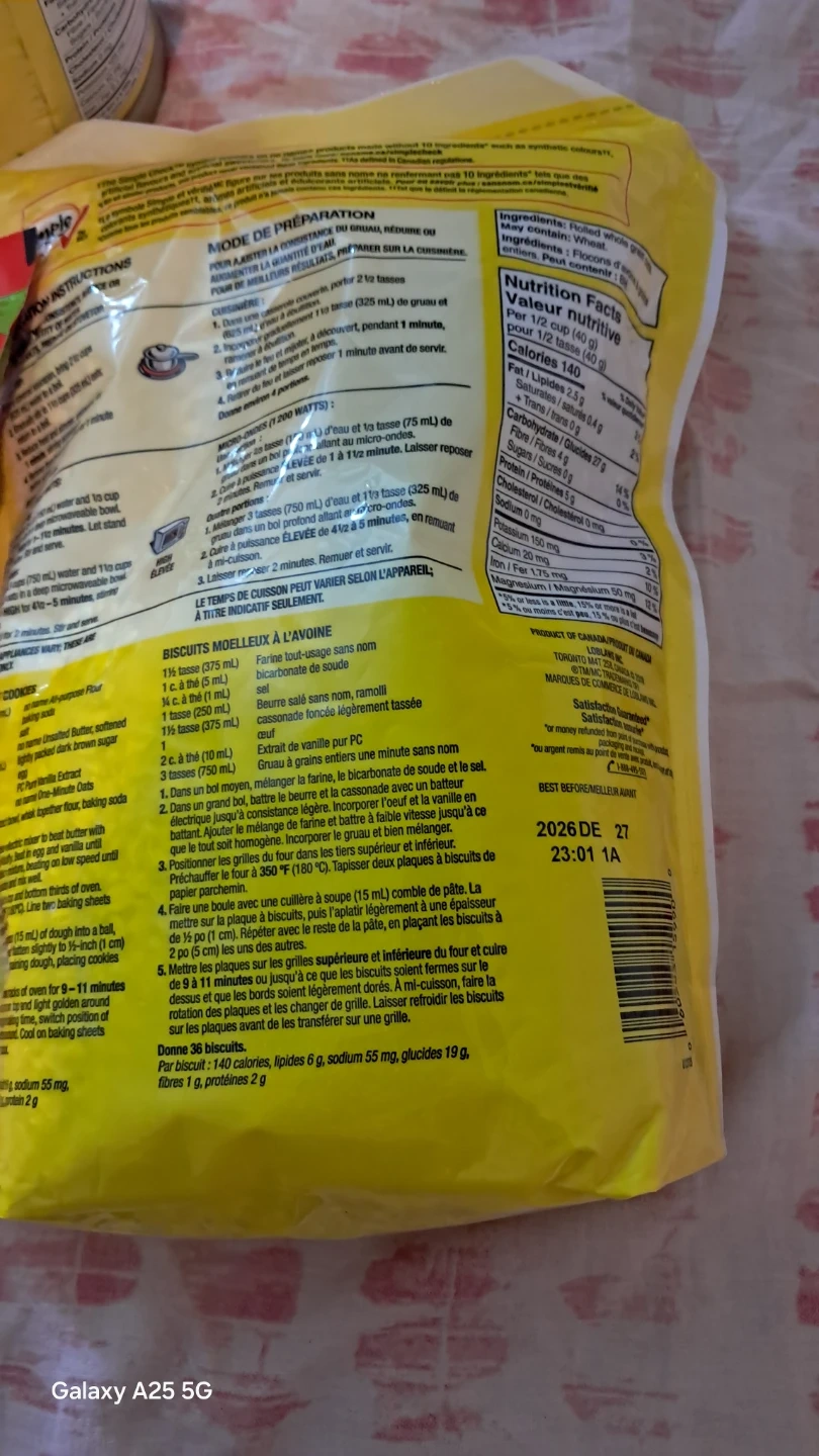 Two bags of Simple & Delicious large flake and one minute Canadian oats. Also includes MTR Foods Dosa mix. Best before dates are 2026-01-01 for the oats and 2024-07-01 for the dosa mix. Perfect for quick breakfasts or delicious meals!