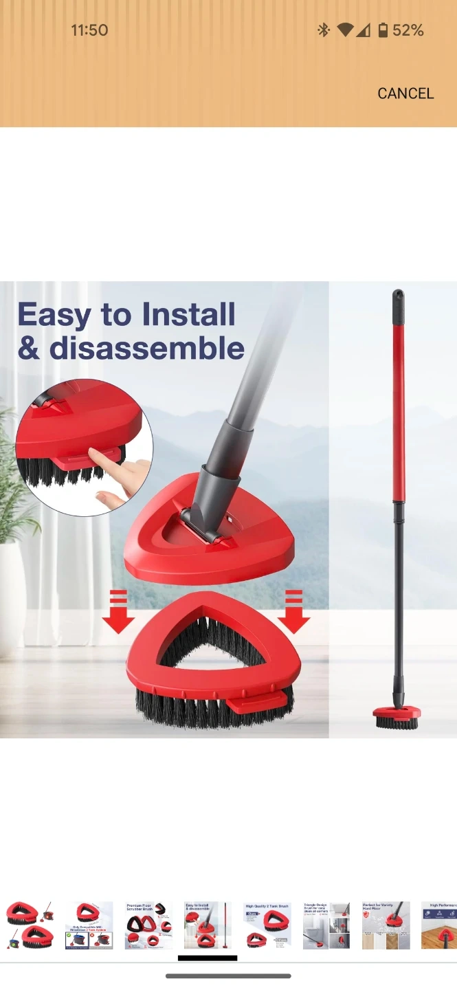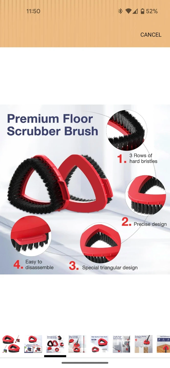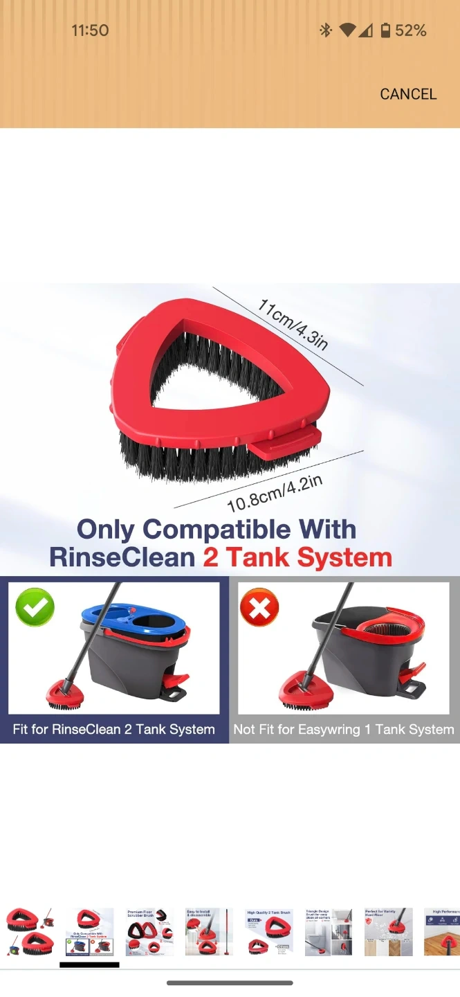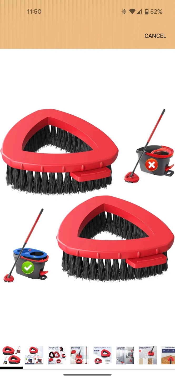 Includes two triangular replacement brush heads for a spin mop. These heads feature 3 rows of hard bristles and a precise design for cleaning. They're easy to install and disassemble. Compatible with RinseClean 2 Tank Systems.
