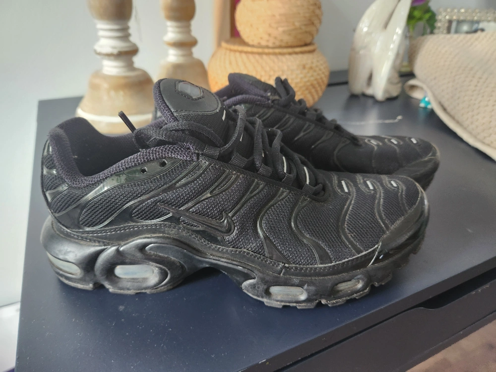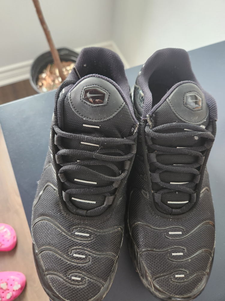 Selling a pair of Nike Air Max Plus TN sneakers in black. These shoes are in used condition, as you can see in the photos. They have the classic Air Max cushioning and the distinctive TN logo. Women's size 9,kids size 7.