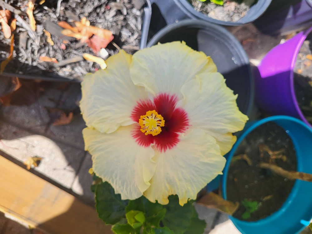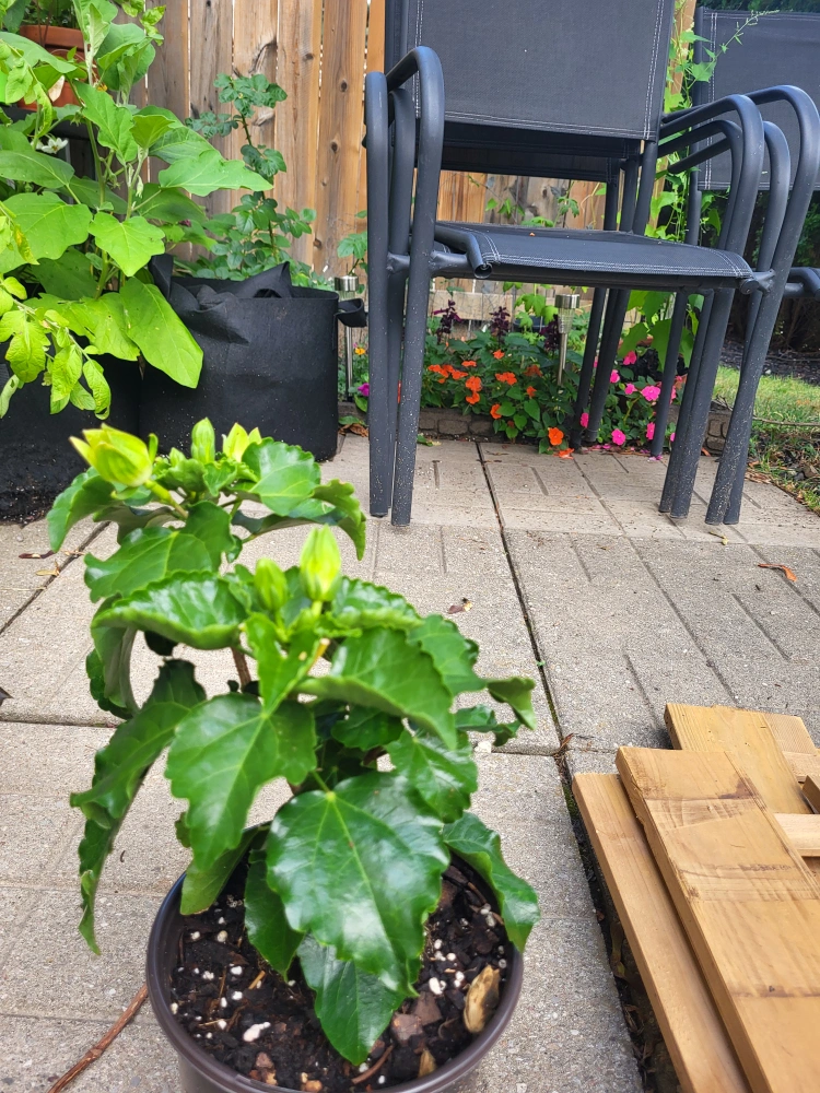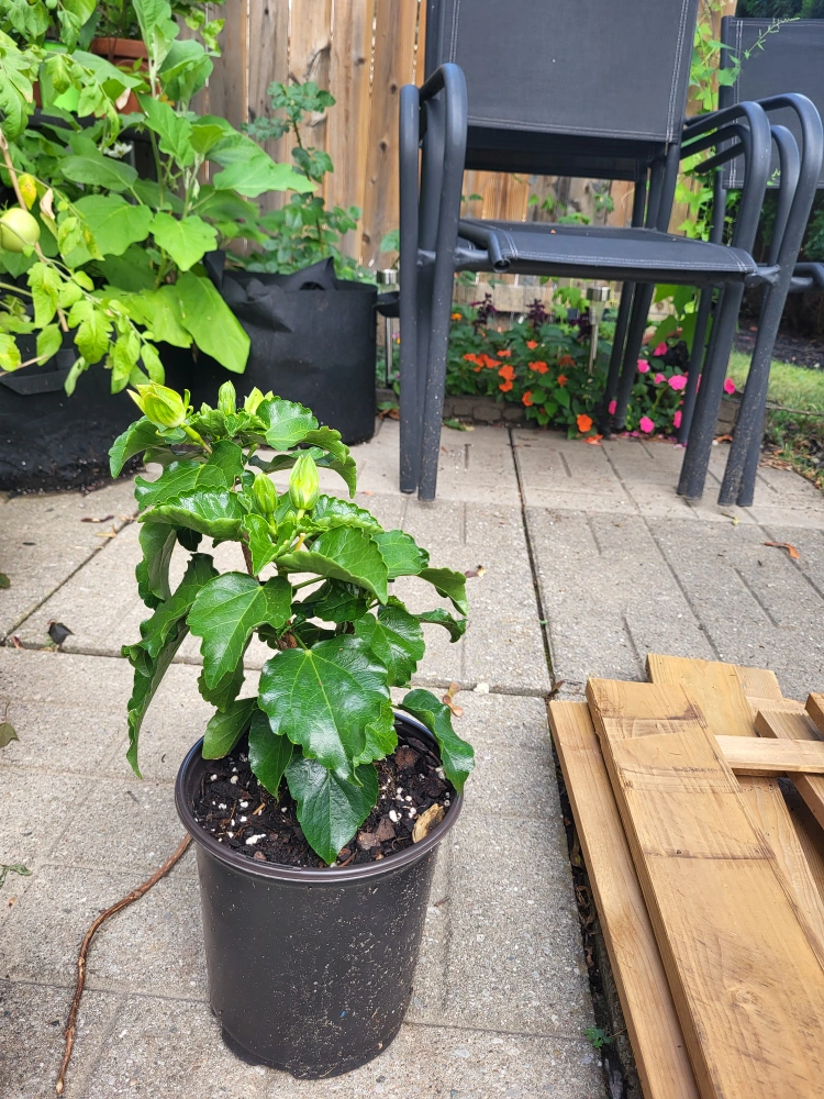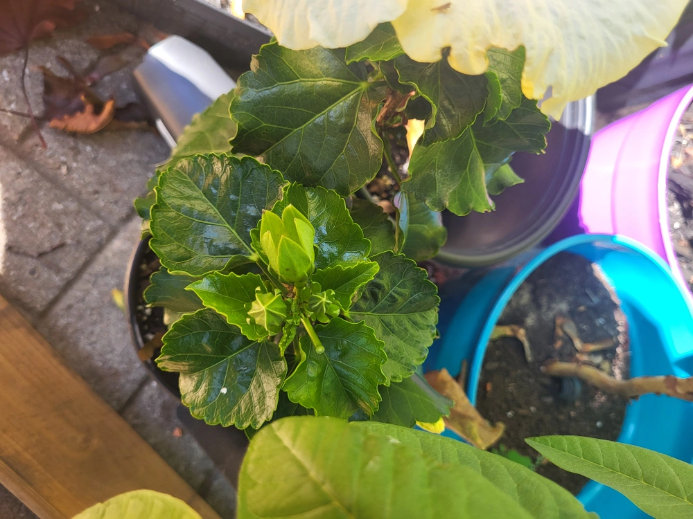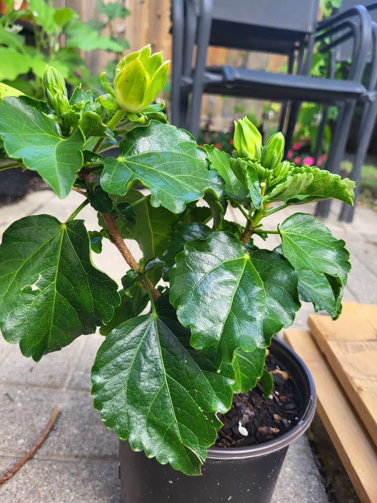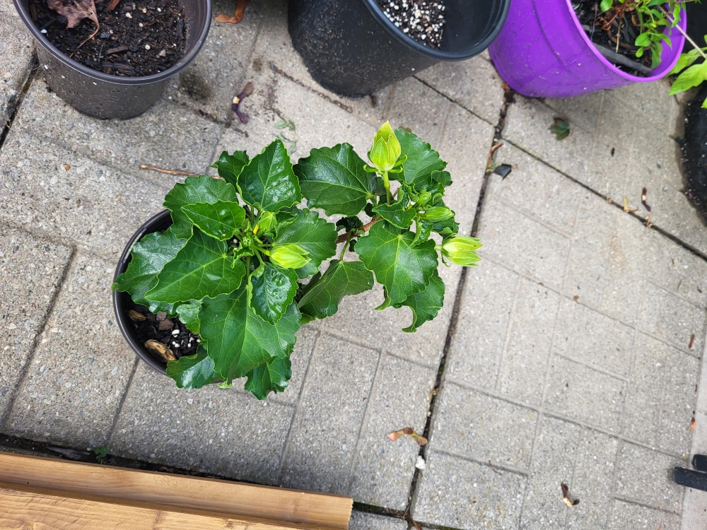 I'm selling a lovely hibiscus plant in a pot! It's a beautiful green colour and would look great in any garden or on a patio. It's still young, with some buds that will open soon.