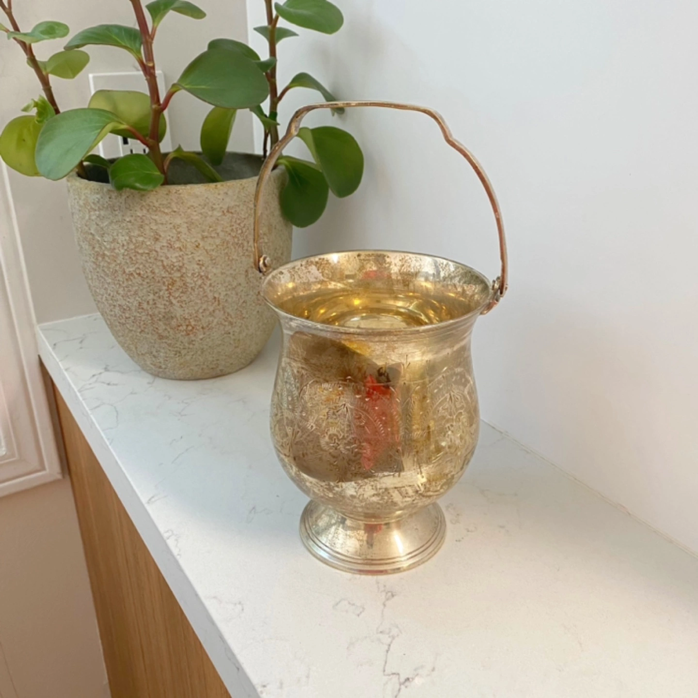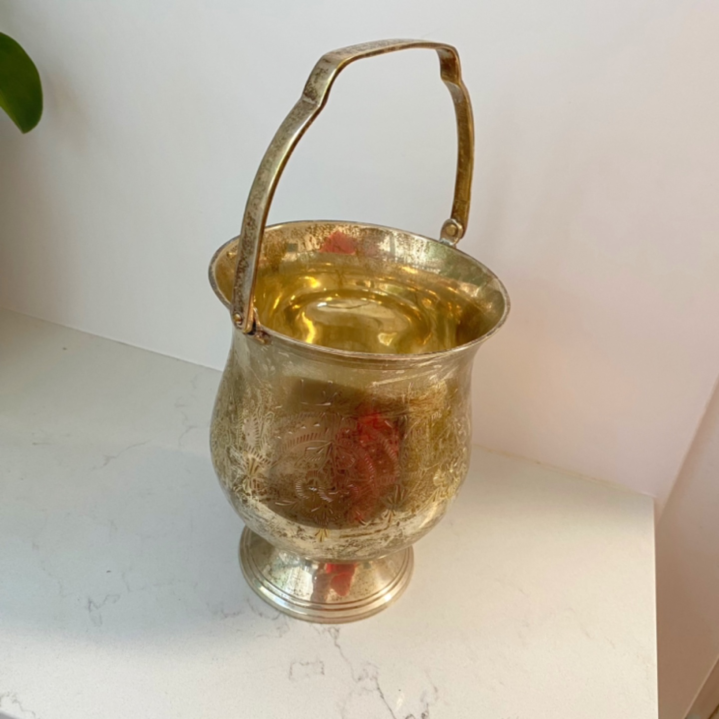 Selling a vintage silver-plated decorative bucket! It has a unique design and would look great as a decorative piece in your home. It has a handle for easy carrying or display. It's in good condition, ready to add a touch of vintage charm to any room