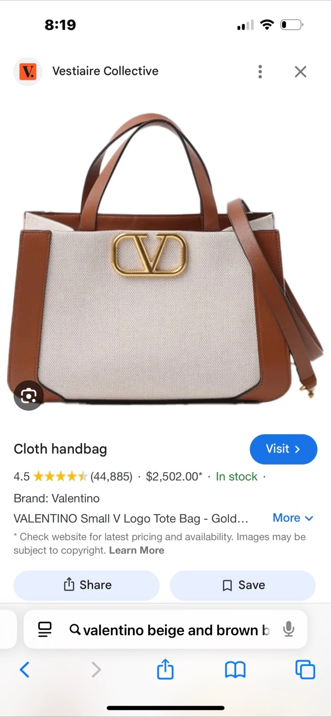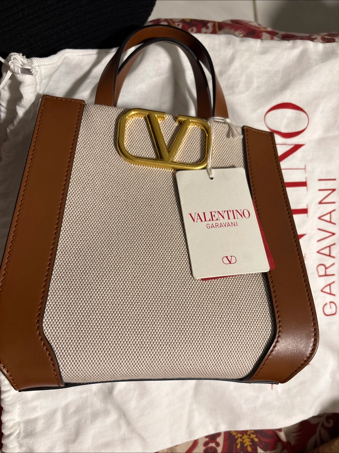 Selling a stylish Valentino Garavani small tote bag in beige and brown! This cloth handbag features the iconic V logo. It's in great condition and ready for a new home