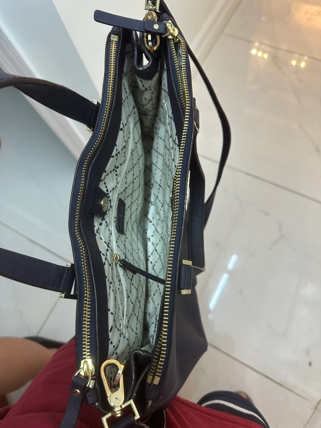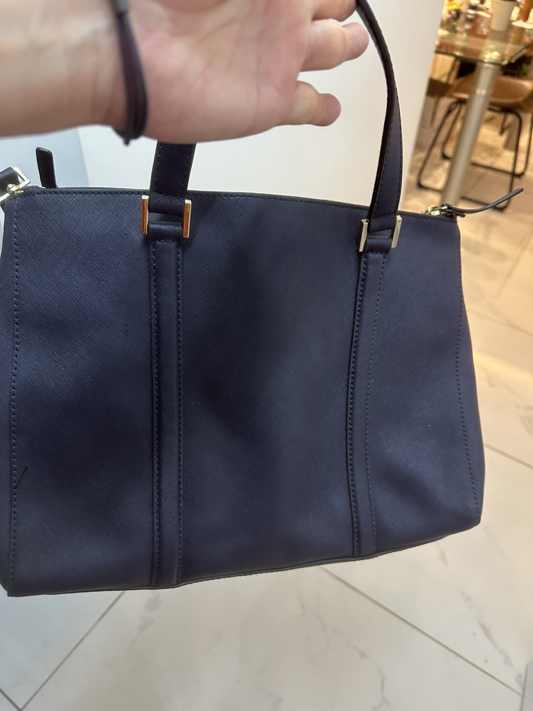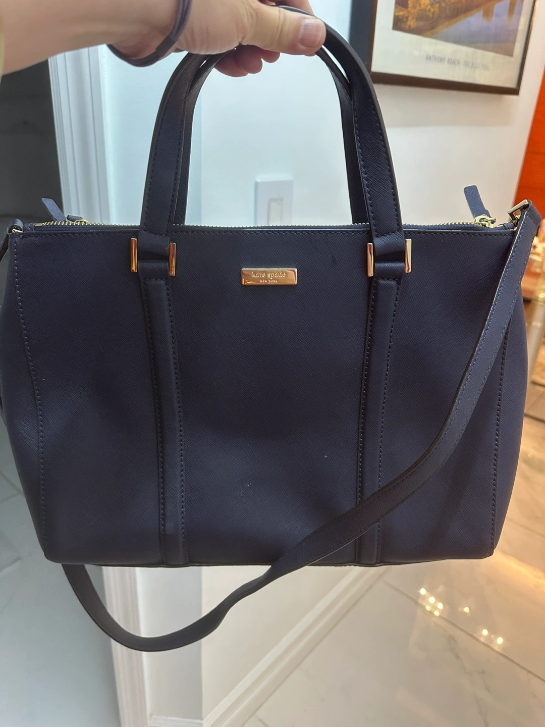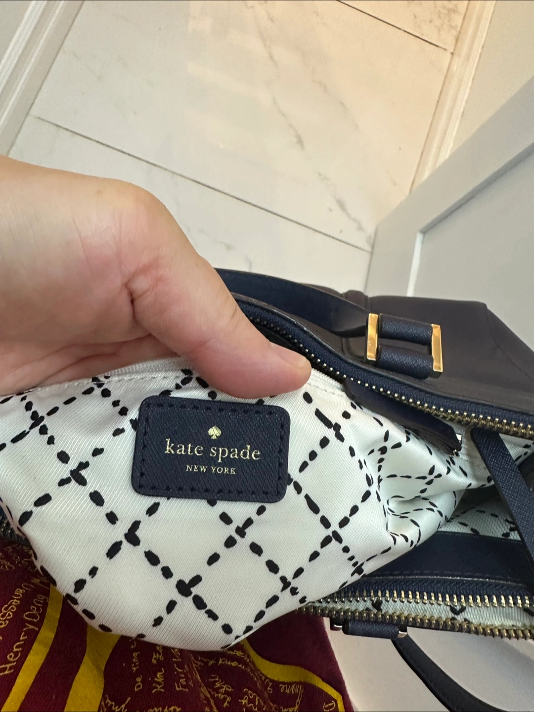Selling a Kate Spade satchel in navy blue! It's in great condition and has a cute patterned interior lining. Perfect for everyday use or dressing up an outfit. New without tag. Need to clean up my closet.