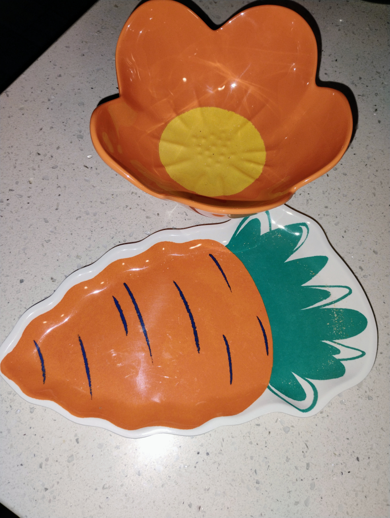 two fun serving dishes! One is shaped like a flower and the other is shaped like a carrot. They are both orange with other colors to accent their shapes.