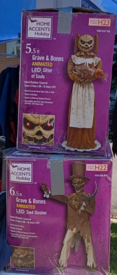 Selling two Home Accents Holiday animated LED figures: a 5.5 ft 'Sitter of Souls' and a 6.5 ft 'Soul Slasher'. Both are Grave & Bones themed and suitable for indoor/outdoor covered use. They have a timer for 6 hours on/18 hours off and feature illuminated eyes selling them as a pair