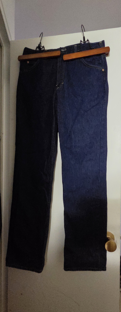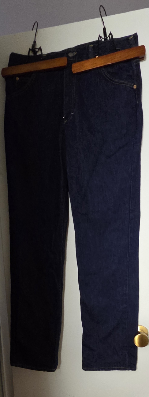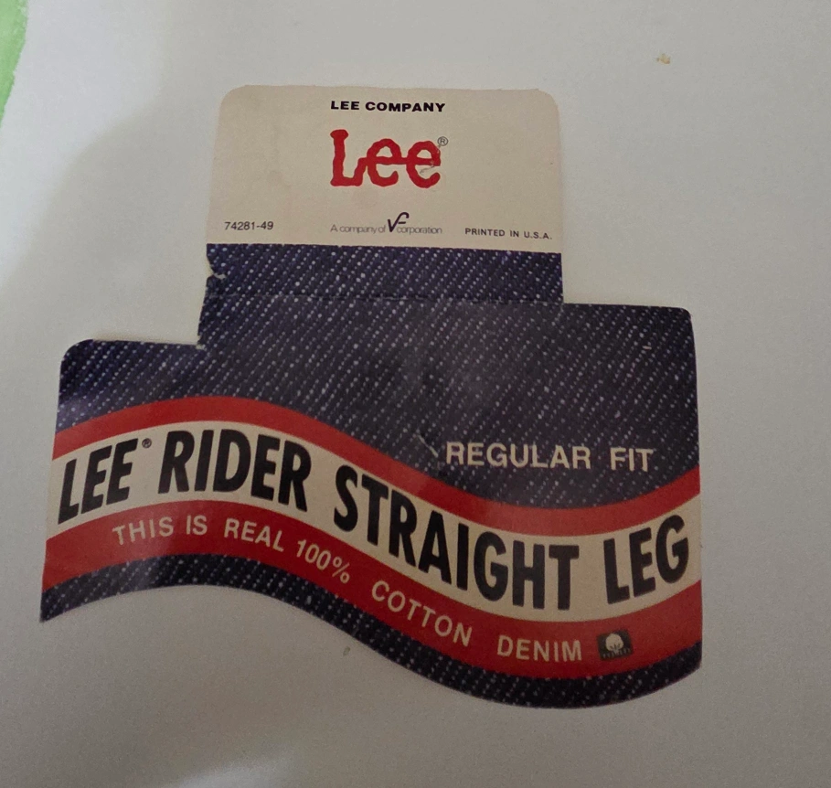 New pair of Lee Jeans Rider, Regular Fit, Straight Leg Size 34x34. I think they are men's. I ordered them online, got the wrong size, and cut. I bought women's jeans, in a different size. I took off the tags to wash them, then realized the error, but couldn't return them. I think they were a little more than $60. My loss is your gain!