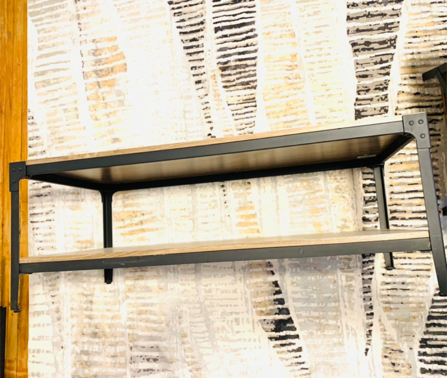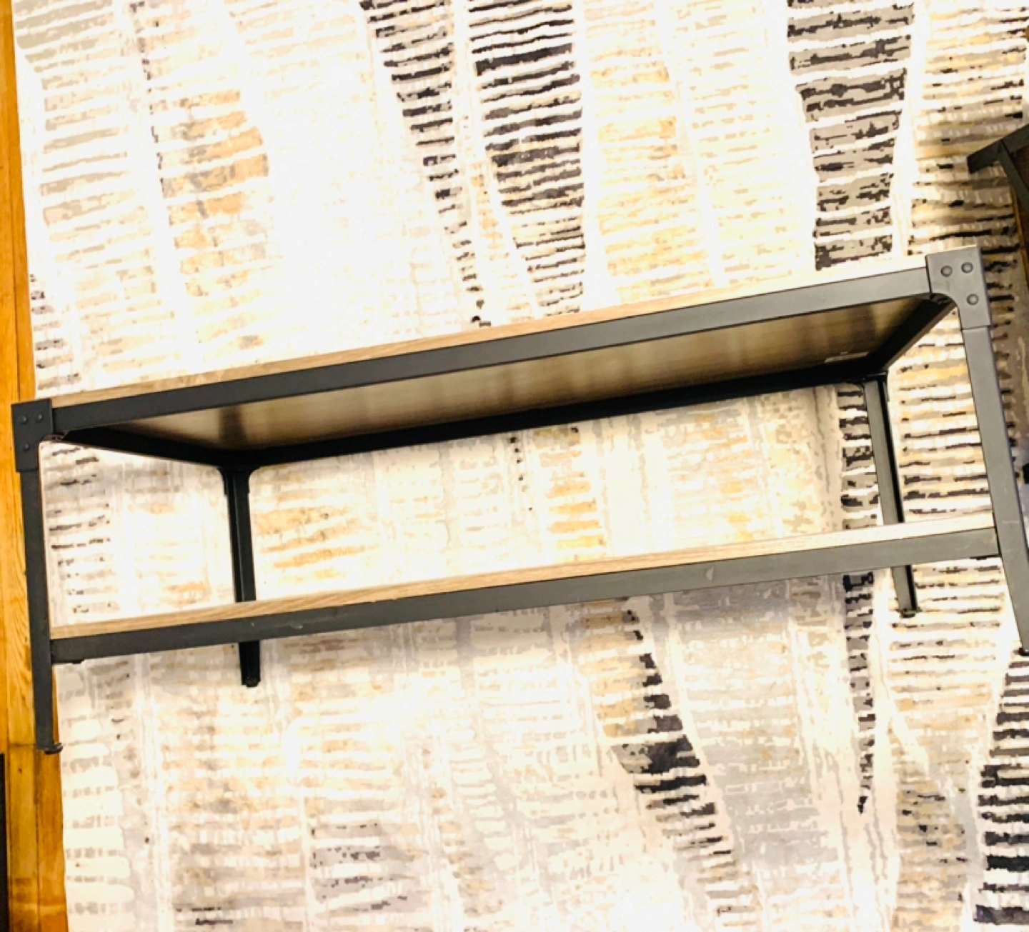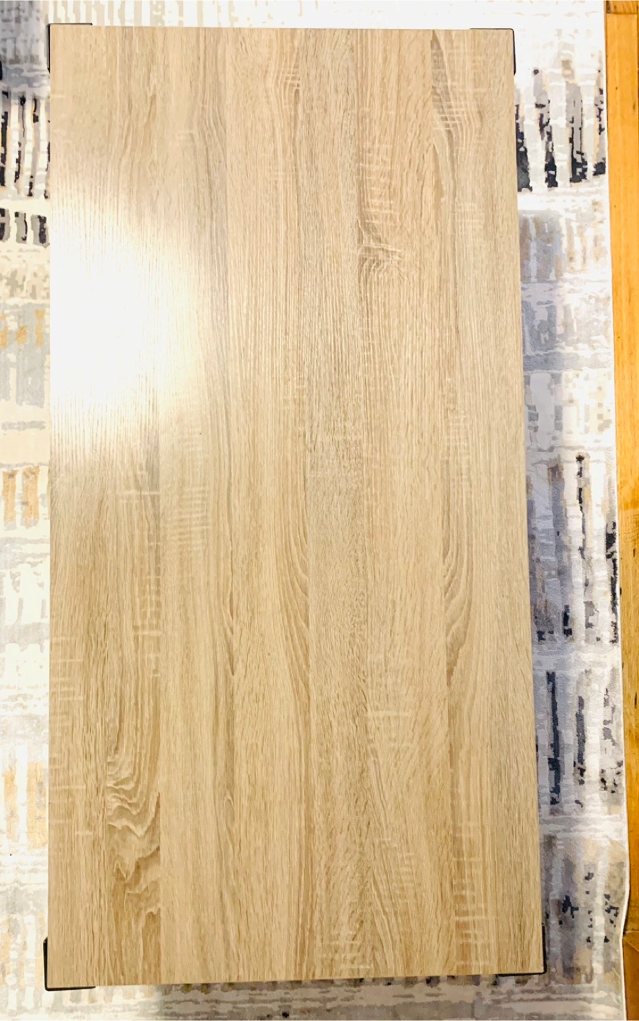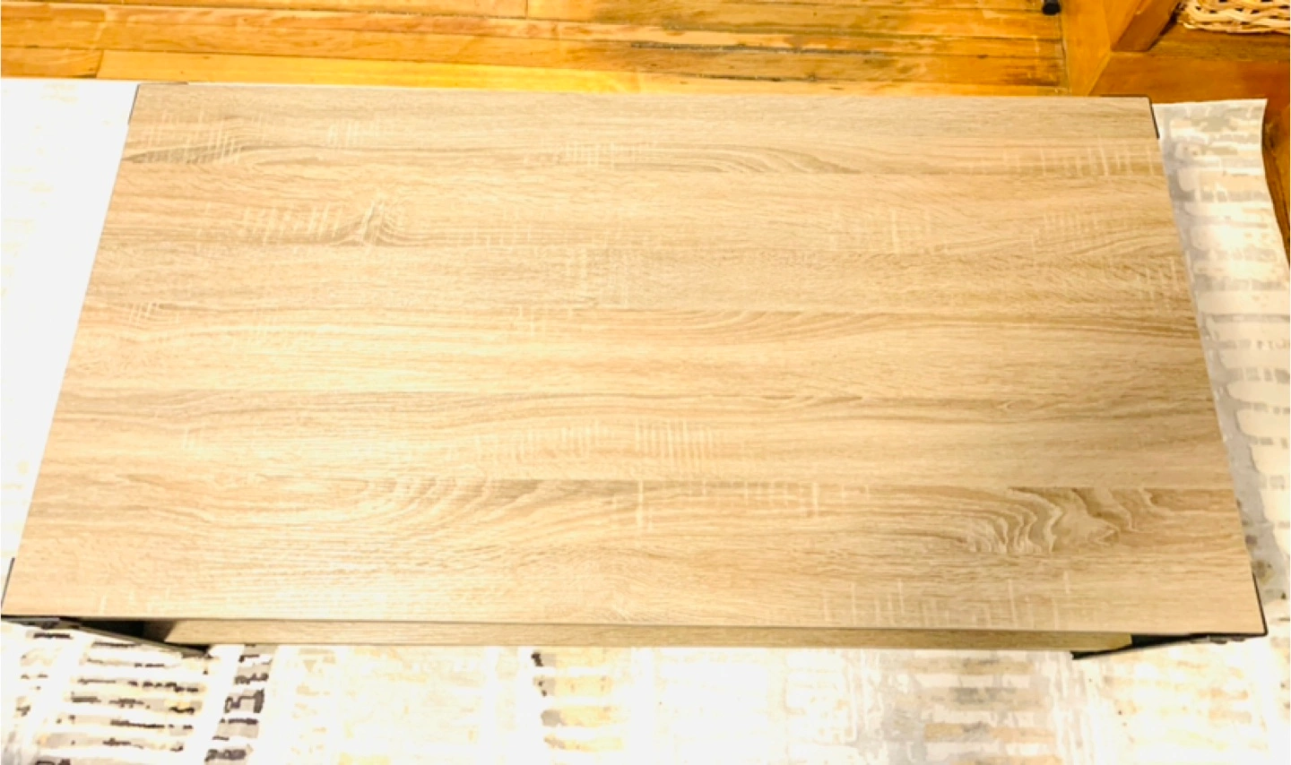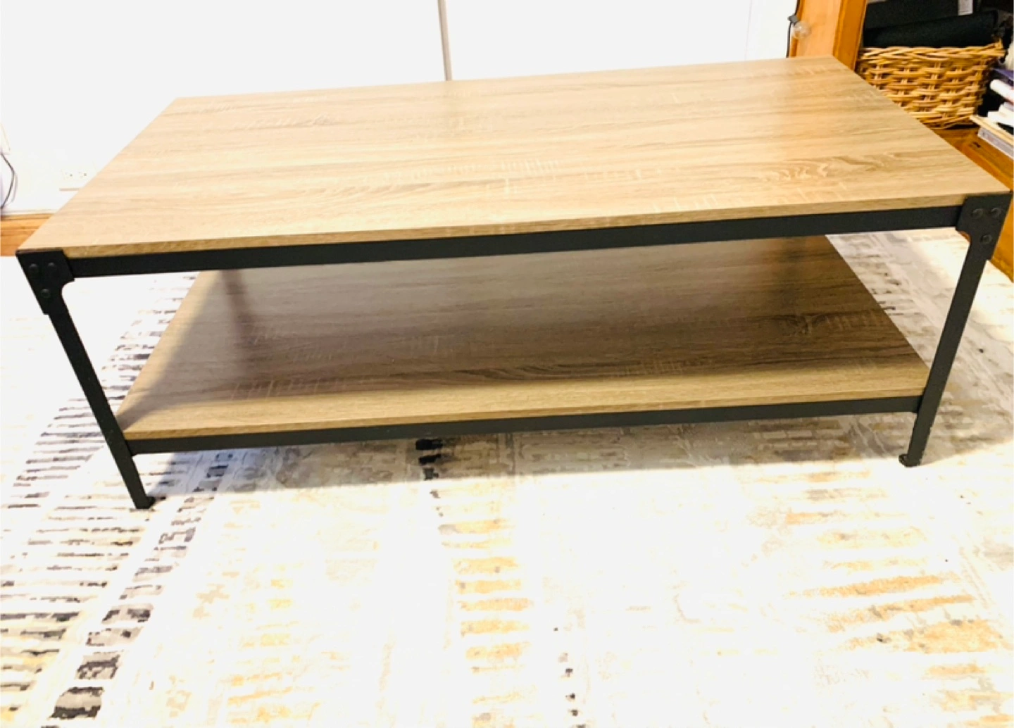 Selling a coffee table with a wood-look top and a black metal frame. It has a shelf underneath for extra storage. Great for a living room or den!