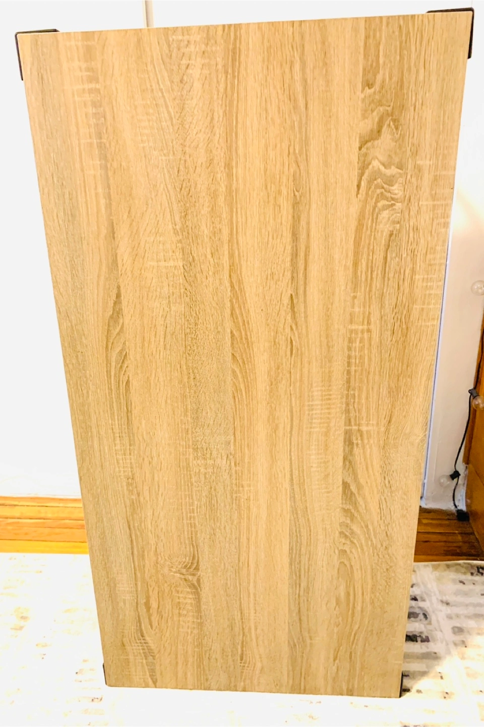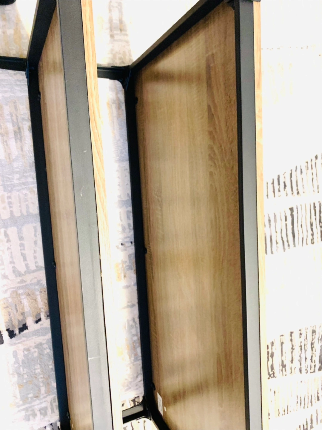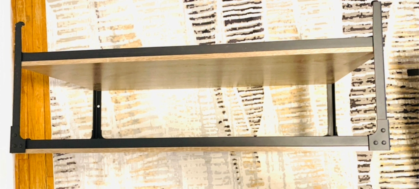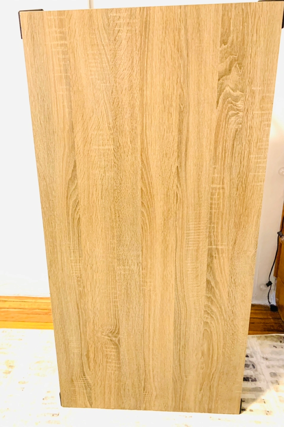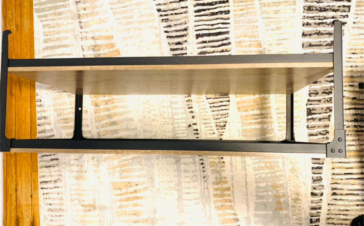 Selling a coffee table with a wood-look top and a black metal frame. It has a shelf underneath for extra storage. Great for a living room or den!