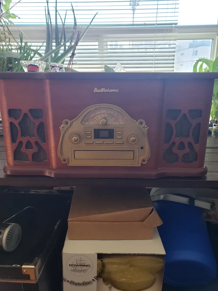 Selling an Electrohome Wellington record player! It's in great condition and ready to play your favourite vinyl records. The unit has a classic look with a wood finish and gold accents. It also includes a CD player and radio!Cd and radio working perfectly, record player has new stylus works perfectly but it needs new belt, price has been reduced because of it.