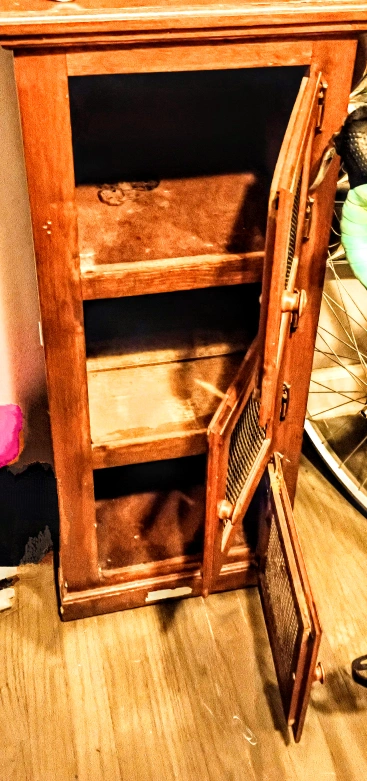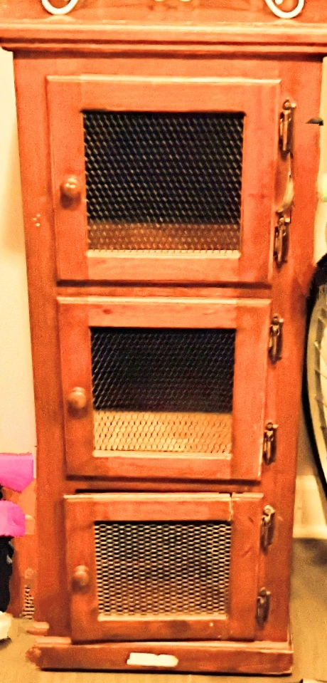 Selling a wooden cabinet featuring three mesh doors! It's perfect for adding a touch of rustic charm to any room. The cabinet offers ample storage space with three shelves.