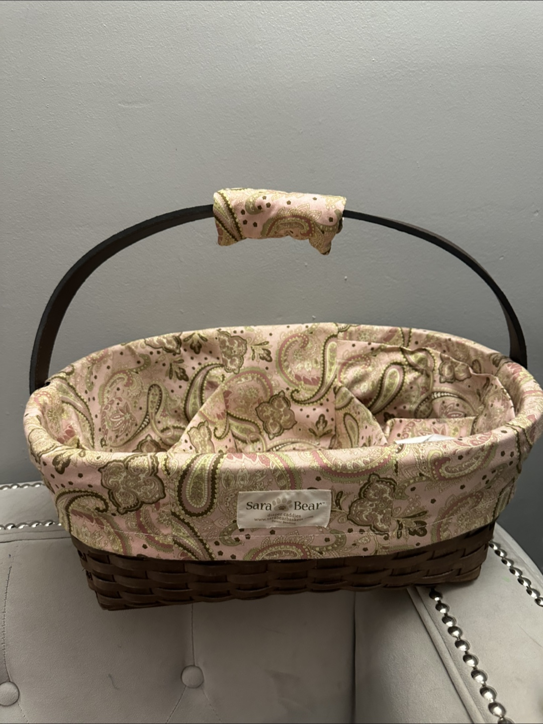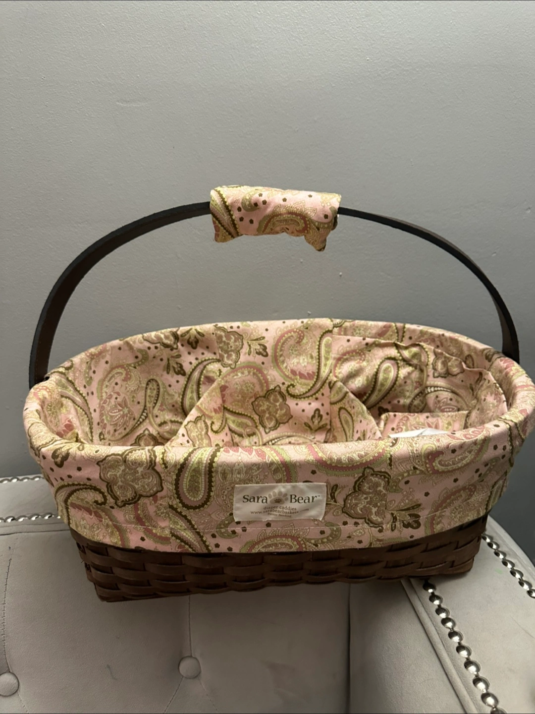 Here's a cute Sara Bear diaper caddy basket! It features a lovely pink paisley fabric lining and a sturdy woven wood exterior. Perfect for keeping baby essentials organized and within reach