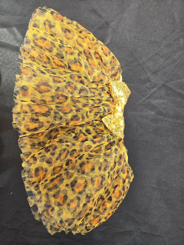 A cute tutu featuring a leopard print design and a sparkly gold sequin bow! Perfect for dress-up or dance class