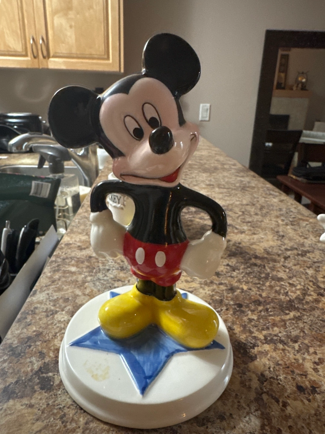 All 4pieces !!!! Selling a vintage Mickey Mouse variety of porcelain figurines, etc. It's in very good condition and features Also included is a Mickey Mouse pin! and a porcelain schimd from Walt Disney figurine. Toothbrush holder and kissing salt and pepper shakes all 4for 10