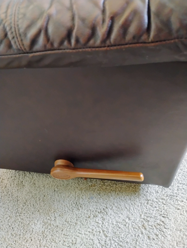 Here's a comfy brown leather recliner armchair! It's perfect for relaxing after a long day. It shows some signs of wear, but it's still got plenty of life left in it