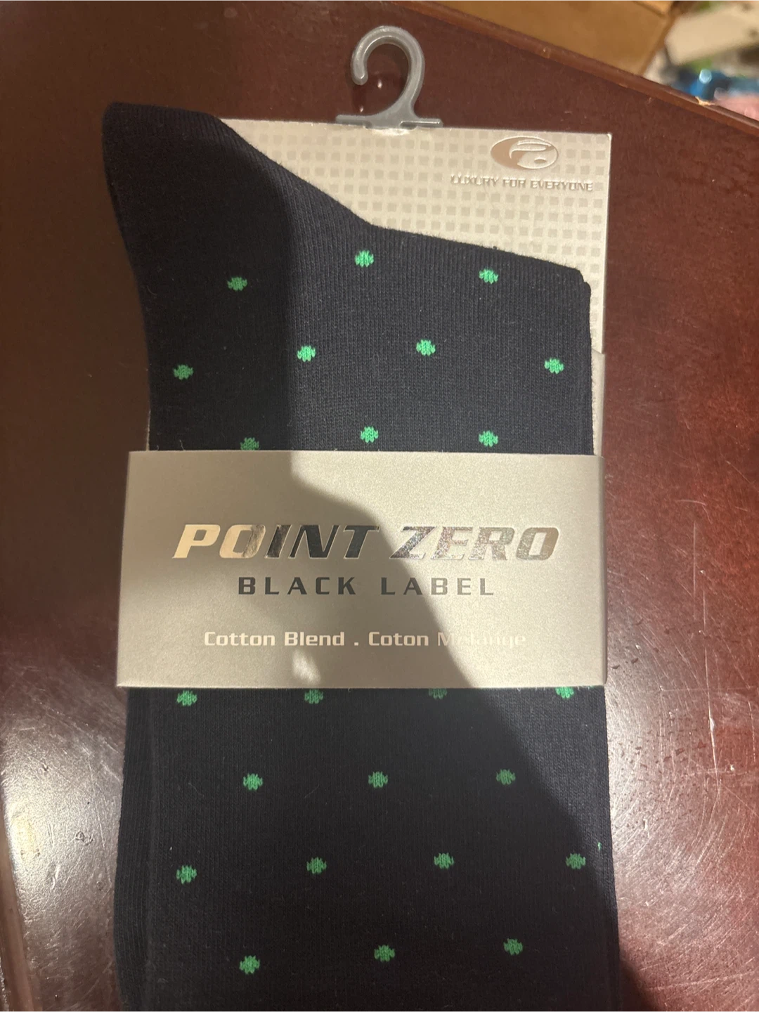 Point Zero Black Label socks, still in the package! They are a cotton blend and are size 10-13. The socks themselves are black with little green polka dots!