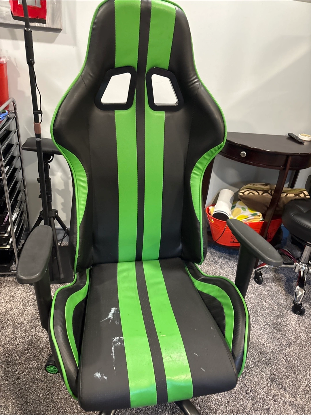Selling a green and black gaming chair. It has some signs of use on the seat, as shown in the pictures. Still works great!