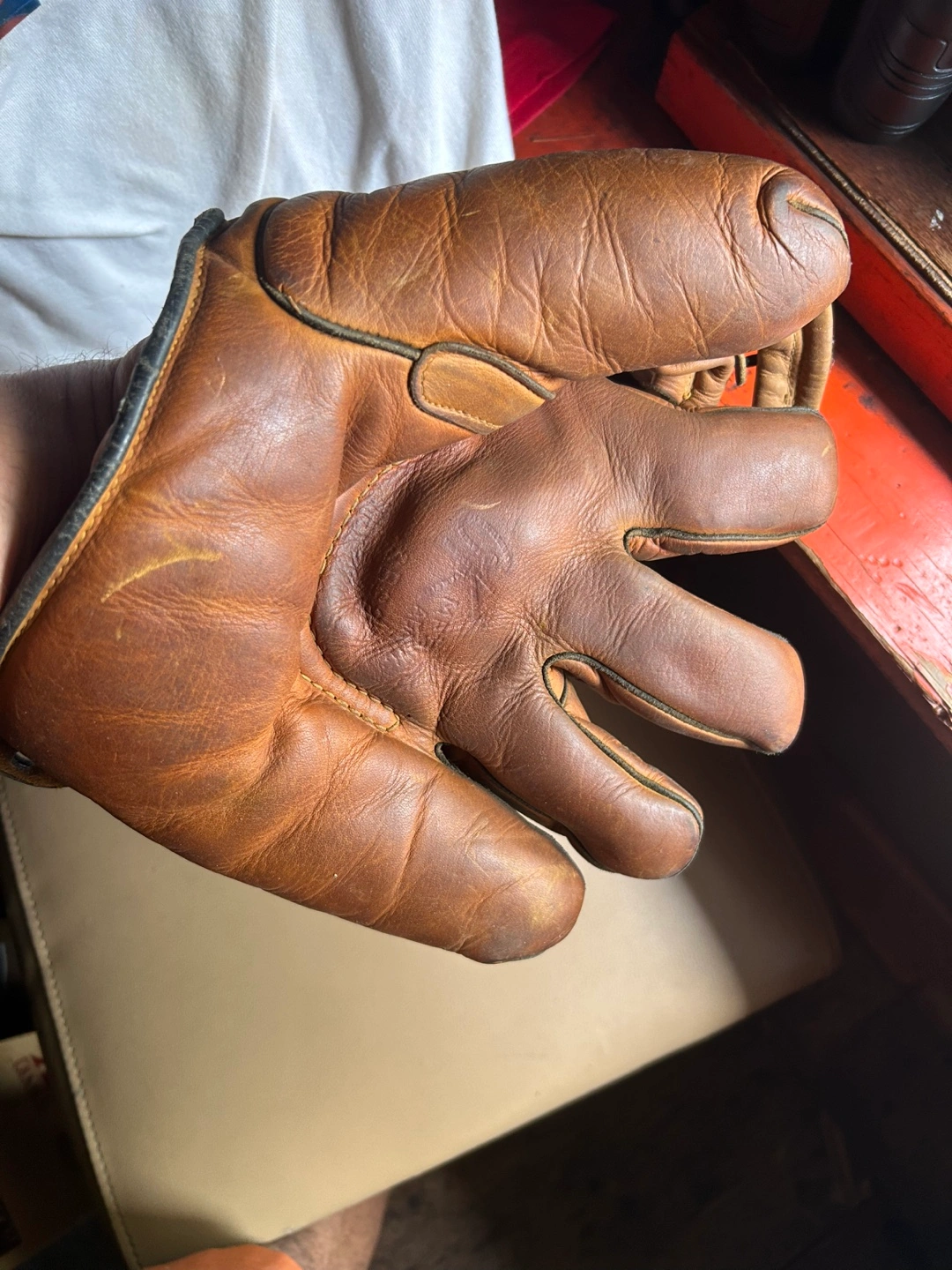 Selling a vintage leather baseball glove. It has a classic look and feel. Perfect for collectors or anyone who appreciates a well-worn glove. Shows signs of wear consistent with age and use, adding to its character