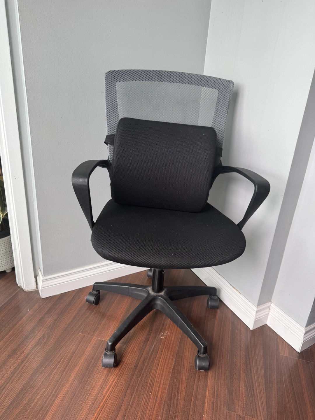 Selling a black office chair in great condition! It features adjustable height and lumbar support, so you can stay comfortable during those long work sessions. The chair also has a free lock feature. Perfect for your home office or study space! With free back rest